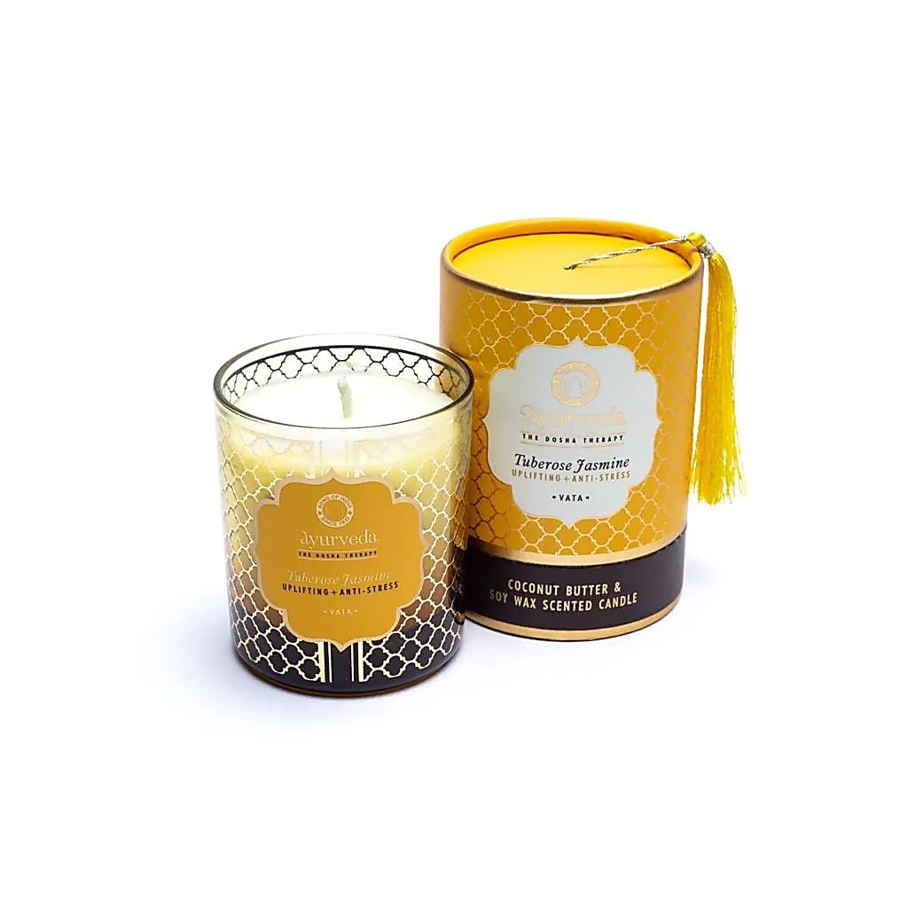 Ponořte se do uvolněné atmosféry s našimi ajurvédskými svíčkami, které jsou vyrobené z luxusního kokosového másla a sójového vosku a provoněné těmi nejjemnějšími esenciálními oleji. Tóny čerstvých květů indického jasmínu se báječně snoubí s bílými květy tuberózy a vytvářejí povznášející a stres uvolňující vůni. Svíčky jsou ručně vylévané a mají bavlněný knot, který zajišťuje méně kouře a čisté a rovnoměrné hoření přibližně 55 hodin. Tím umožňuje dlouhodobé využití svíčky při vašich rituálech. Svíčka je nezbytná pro Vata dóšu*.