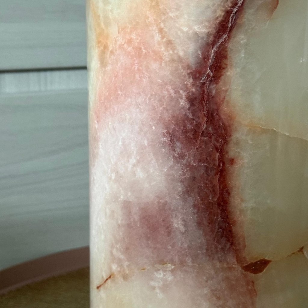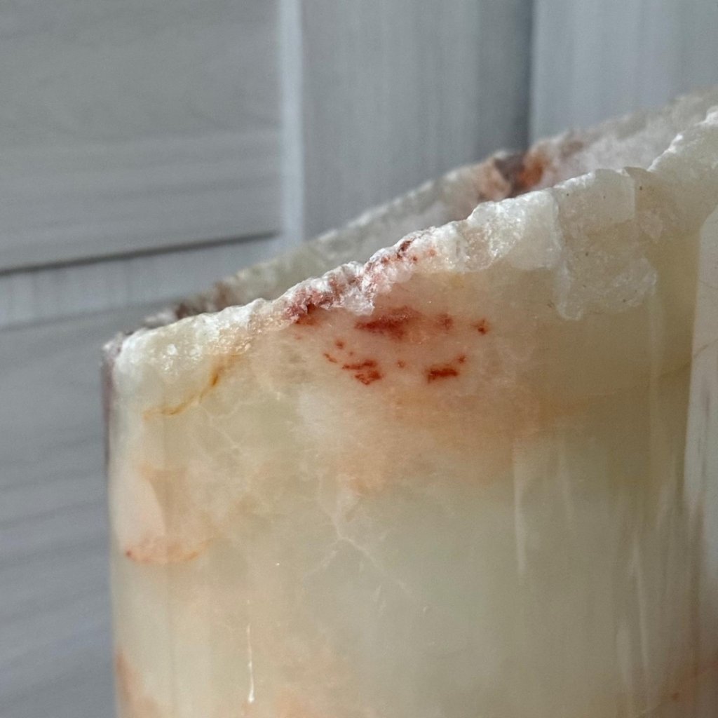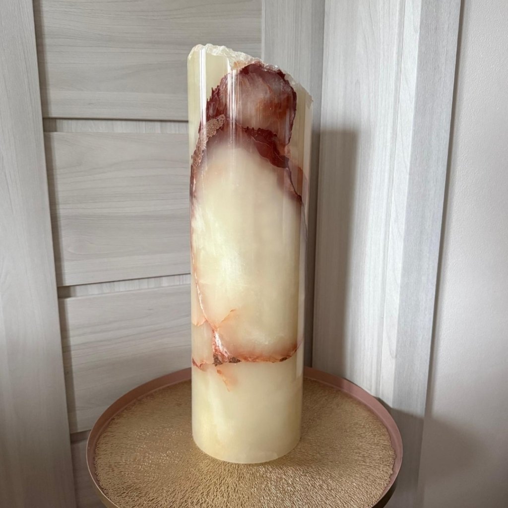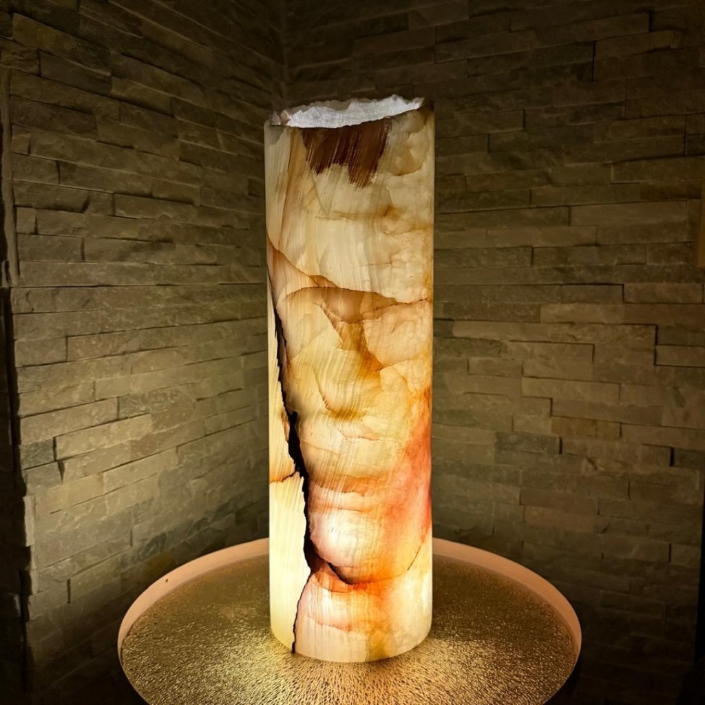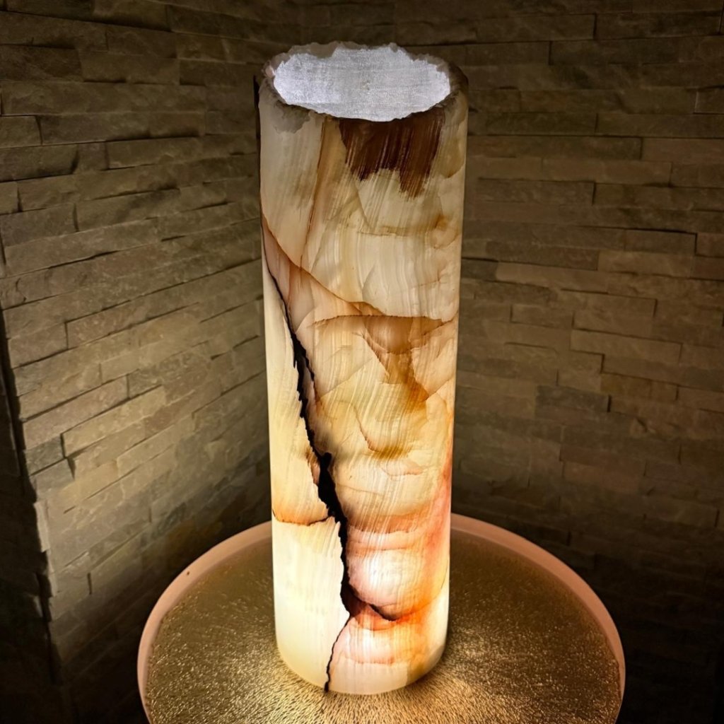 Horní okraj zůstává v přirozené surové podobě s jemně „ozubenou“ strukturou, která krásně kontrastuje s hladce vyleštěným povrchem kamene. Válec je vysoký přibližně 50 cm a působí jako výrazná přírodní dekorace. Pokud ho nasvítíte drobnými LED světýlky, kámen začne jemně prosvítat a promění se v světelnou přírodní sochu, která zútulní celý prostor.