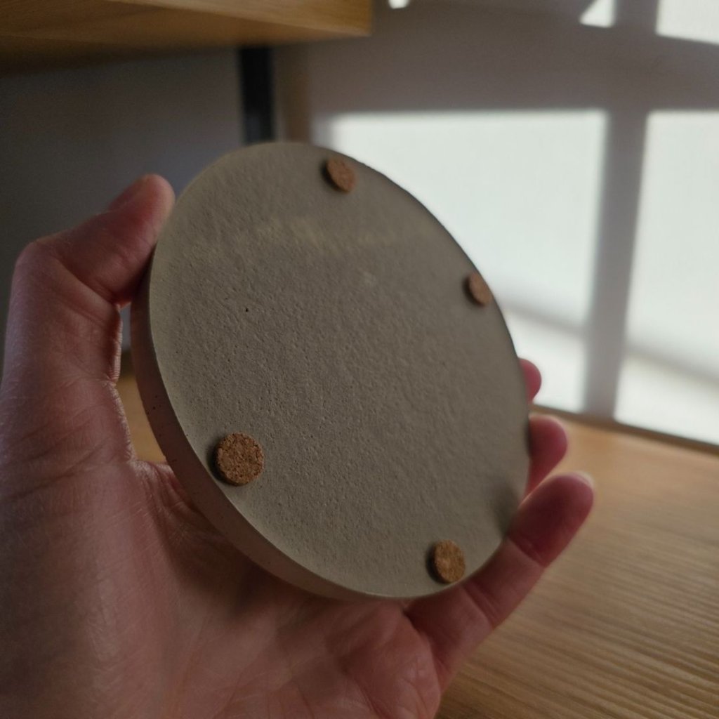 Podtácek má průměr přibližně 10 cm a je ručně vyrobený v České republice. Beton je stabilní a odolný materiál, zároveň přirozeně obsahuje jemné vzduchové bublinky a drobné odchylky, které z každého kusu dělají originál. Spodní stranu tvoří korkové chrániče proti poškrábání, které zároveň tlumí případný náraz. Výrobek je navíc ošetřen ochrannou impregnací, takže lépe odolává běžnému používání.
