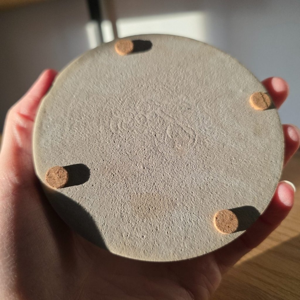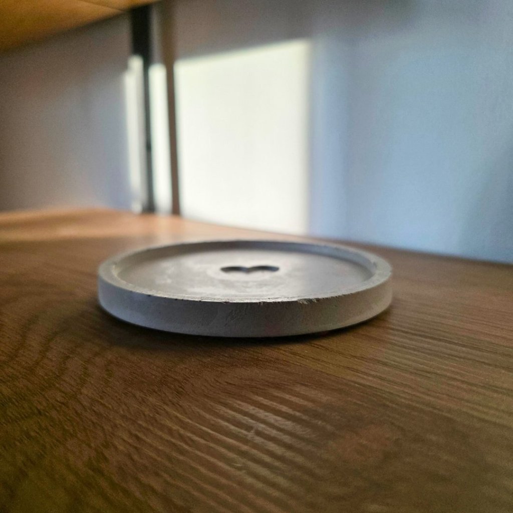 Podtácek má průměr přibližně 10 cm a je ručně vyrobený v České republice. Beton je stabilní a odolný materiál, zároveň přirozeně obsahuje jemné vzduchové bublinky a drobné odchylky, které z každého kusu dělají originál. Spodní stranu tvoří korkové chrániče proti poškrábání, které zároveň tlumí případný náraz. Výrobek je navíc ošetřen ochrannou impregnací, takže lépe odolává běžnému používání.