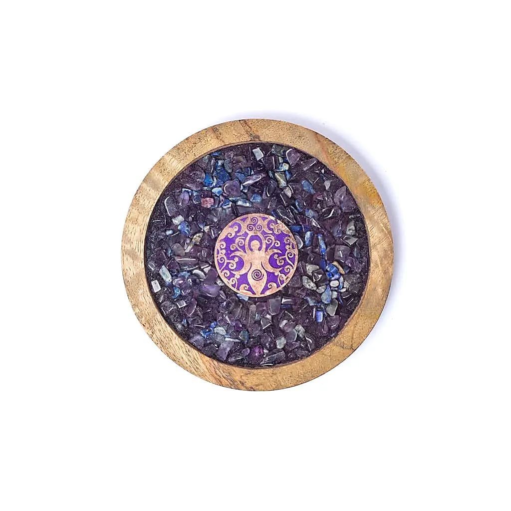 - Podtácek se symbolem Bohyně – dřevěný podtácek z mangového dřeva s polodrahokamy (lapis lazuli a ametyst), který slouží jako jemný harmonizační doplněk a místo pro drobnosti během jógových či klidových chvil.