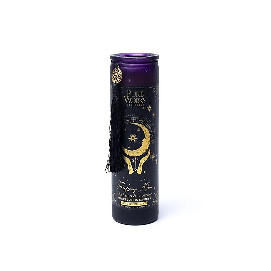- Manifestační svíčka – Purifying Moon – svíčka ve skle s očistnou vůní Palo Santo a levandule, která pomáhá zklidnit mysl, pročistit prostor a vytvořit tichou, harmonickou atmosféru ideální pro večerní relax.