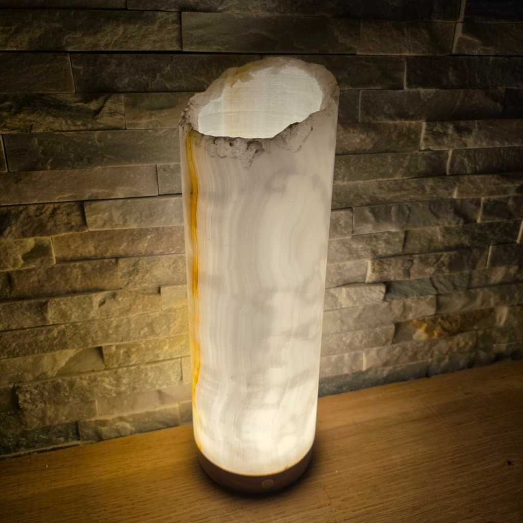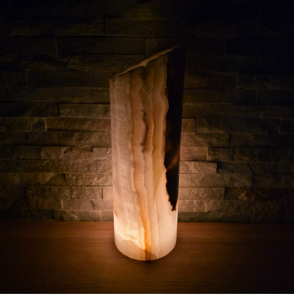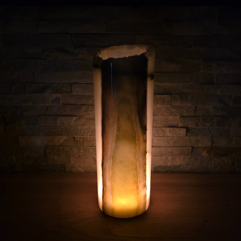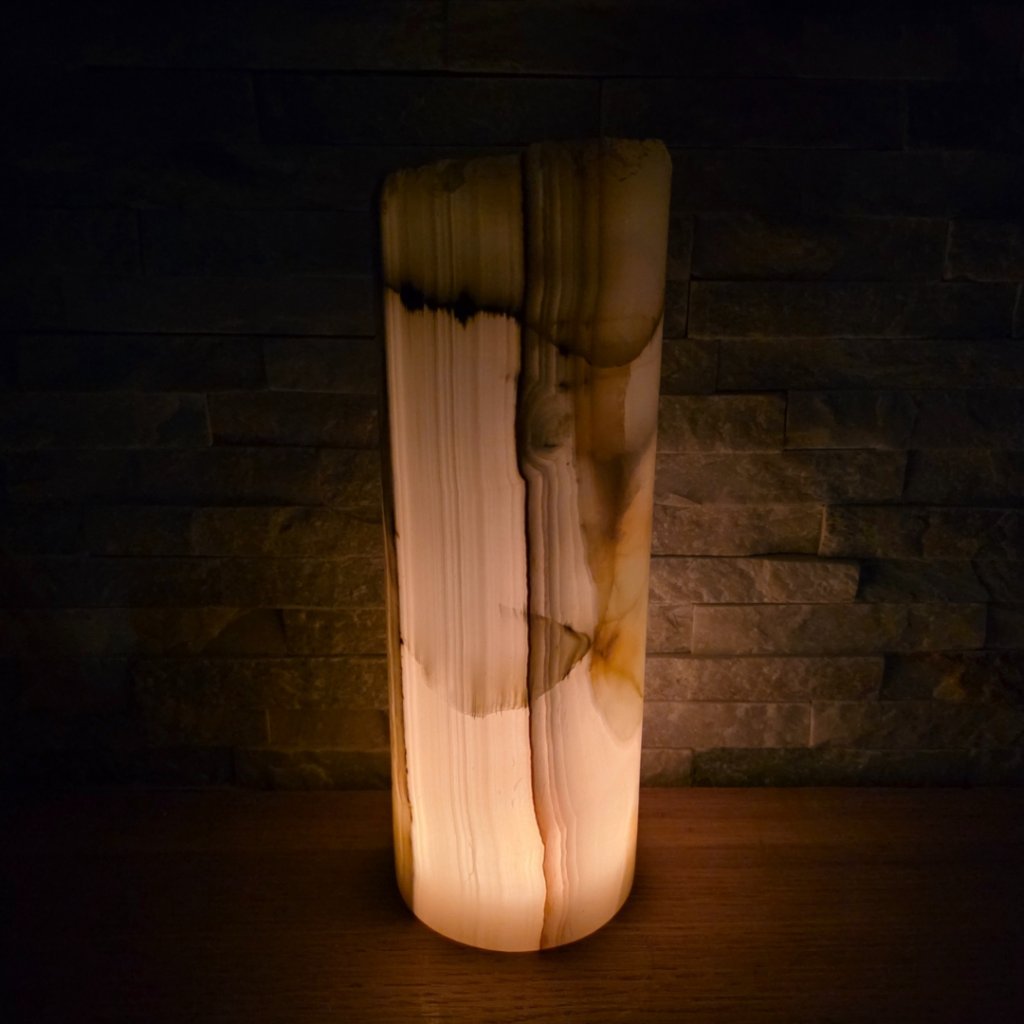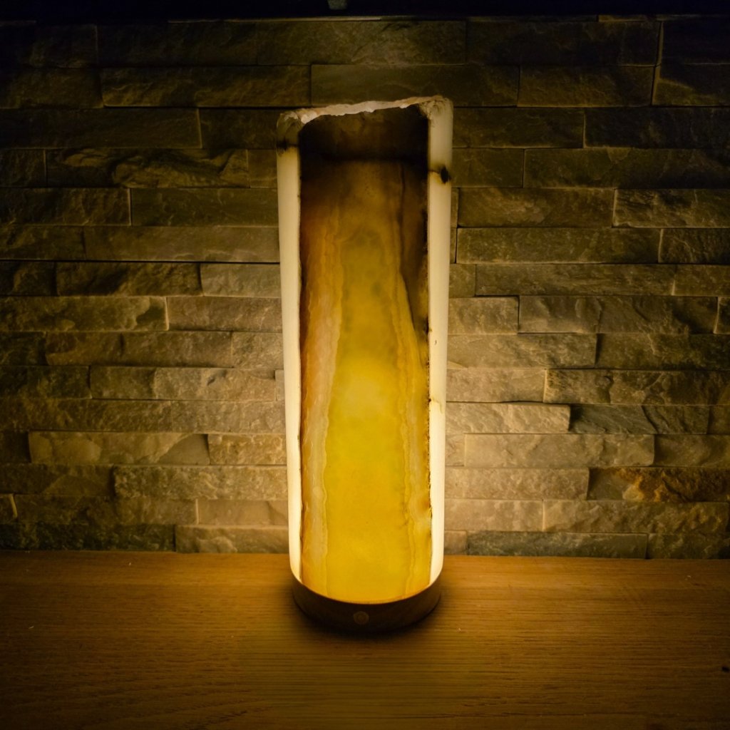 Elegantní válec z přírodního aragonitu o výšce cca 30 cm a průměru 10 cm v sobě spojuje přírodní sílu kamene a jemnost světla. Každý vznikal po tisíce let v pákistánských horách a jeho vrstvy minerálů vytvářejí nezaměnitelné žilkování v tónech hnědé, krémové, červené či zelené. Povrch kamene je leštěný do hladka, díky čemuž vyniká přirozený lesk i hloubka barev.