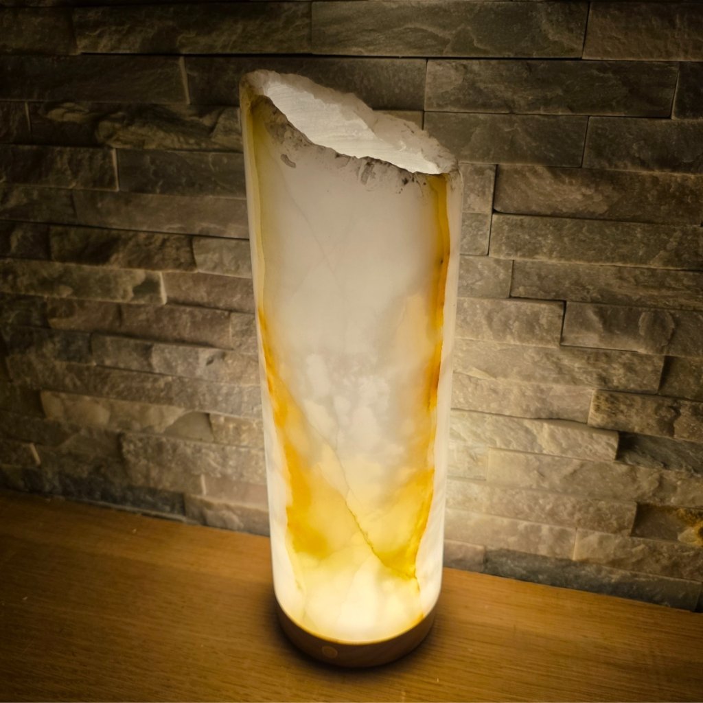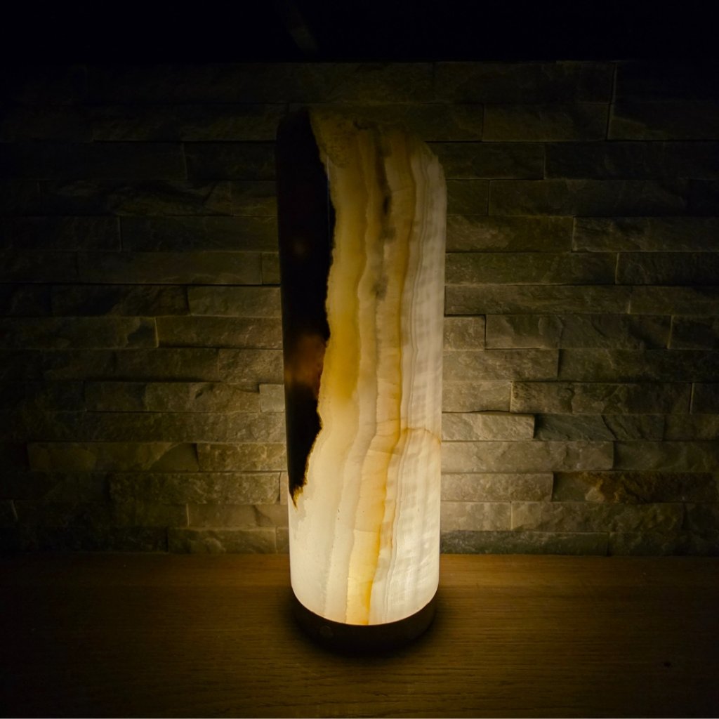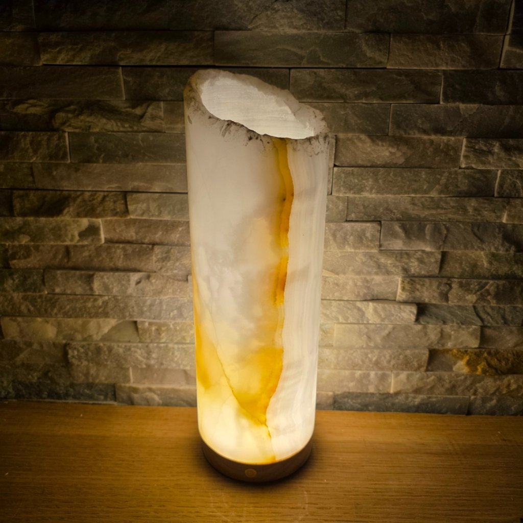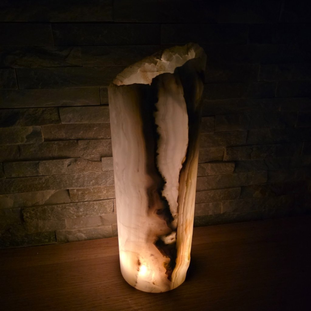 Elegantní válec z přírodního aragonitu o výšce cca 30 cm a průměru 10 cm v sobě spojuje přírodní sílu kamene a jemnost světla. Každý vznikal po tisíce let v pákistánských horách a jeho vrstvy minerálů vytvářejí nezaměnitelné žilkování v tónech hnědé, krémové, červené či zelené. Povrch kamene je leštěný do hladka, díky čemuž vyniká přirozený lesk i hloubka barev.