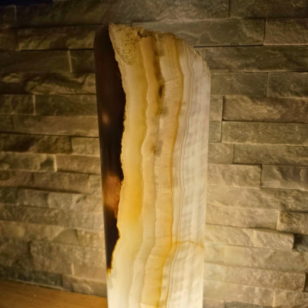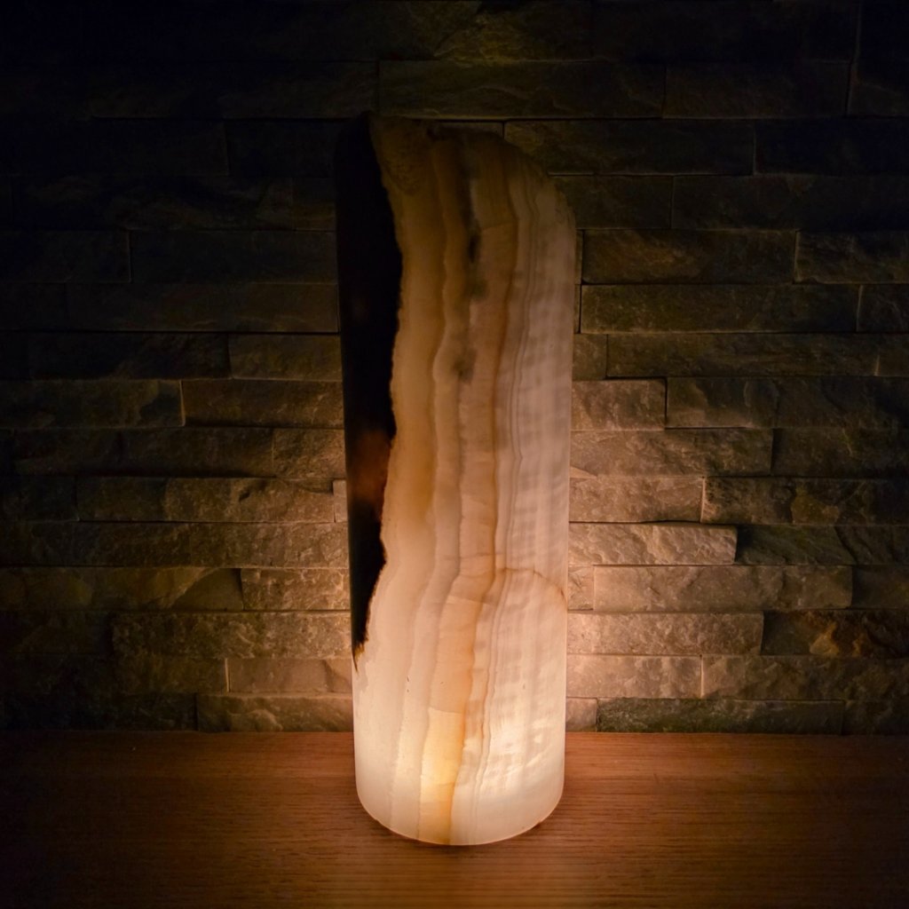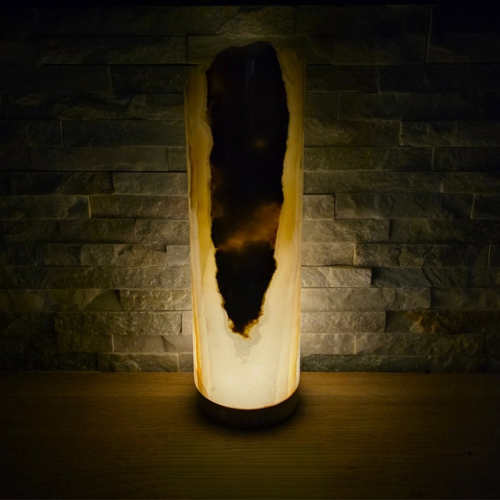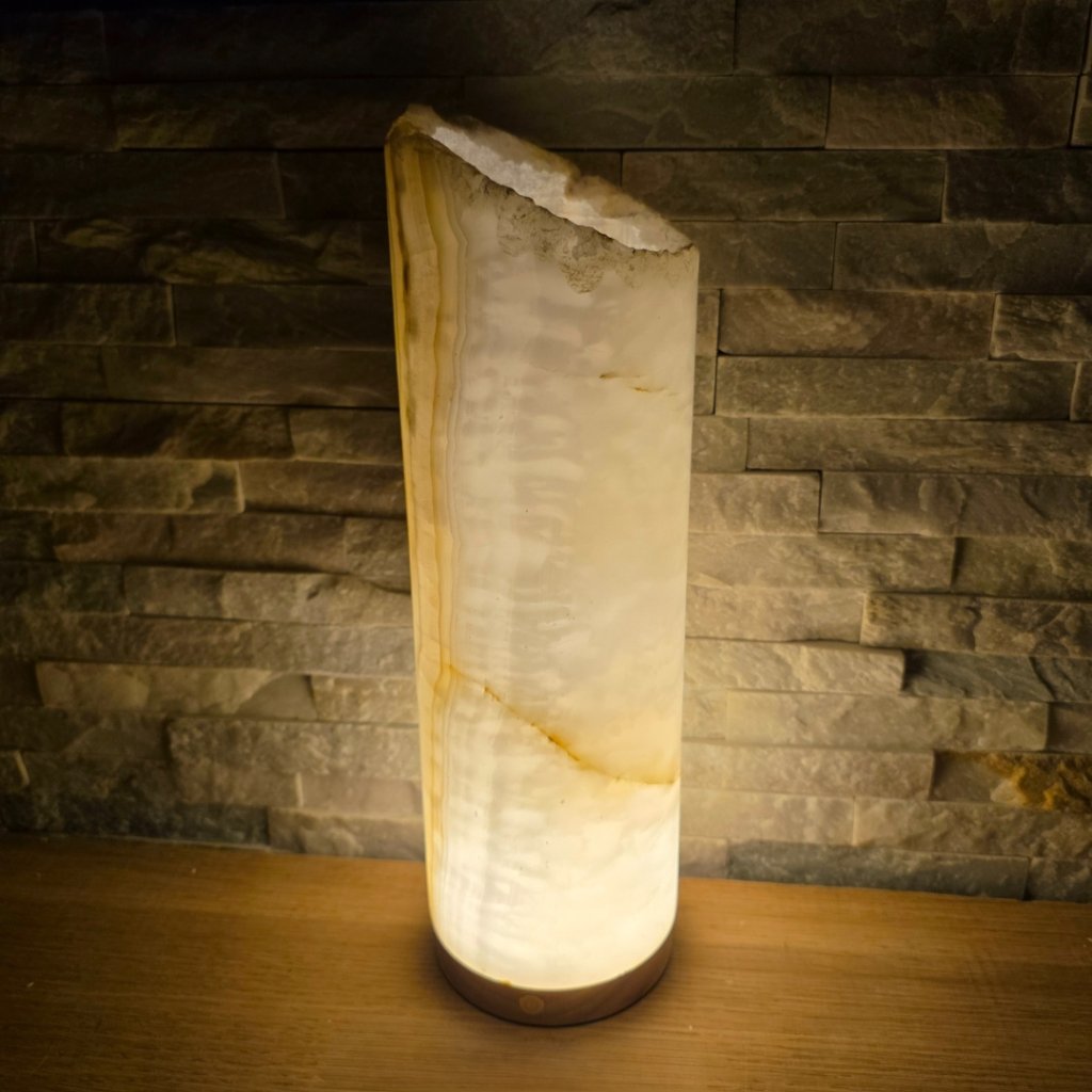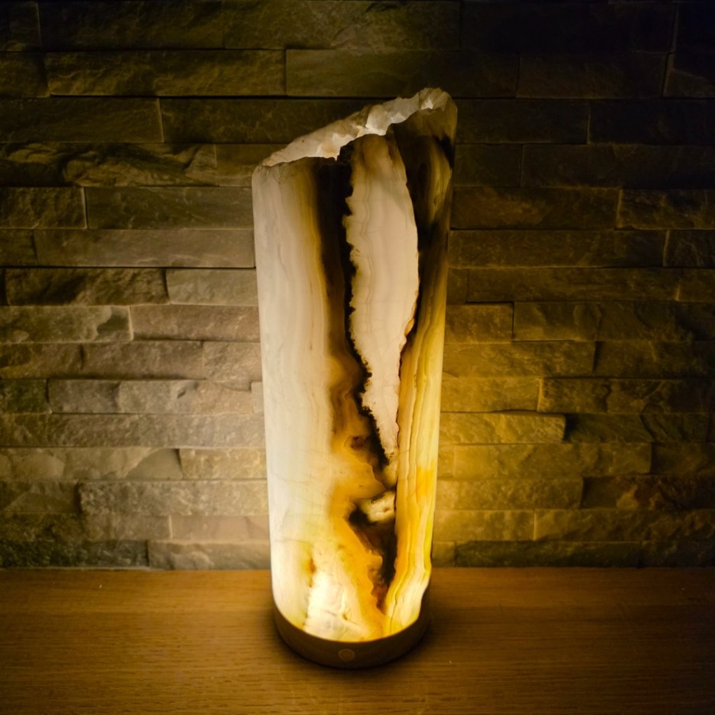 Elegantní válec z přírodního aragonitu o výšce cca 30 cm a průměru 10 cm v sobě spojuje přírodní sílu kamene a jemnost světla. Každý vznikal po tisíce let v pákistánských horách a jeho vrstvy minerálů vytvářejí nezaměnitelné žilkování v tónech hnědé, krémové, červené či zelené. Povrch kamene je leštěný do hladka, díky čemuž vyniká přirozený lesk i hloubka barev.
