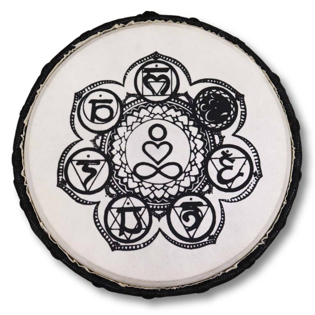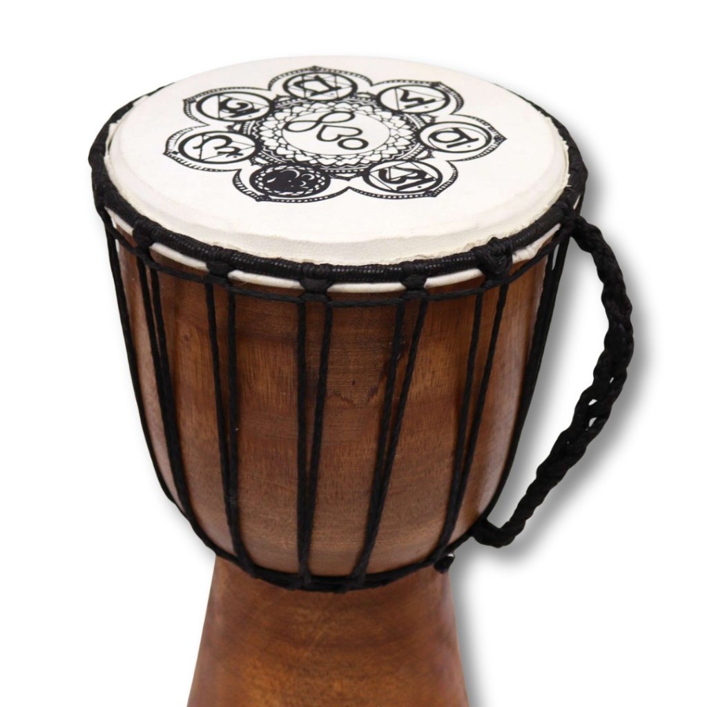 Ručně vyrobený djembe buben z Indonésie přináší do hry nejen rytmus, ale i duchovní hloubku. Na bláně z kozí kůže je vyobrazena mandala 7 čaker, která symbolizuje harmonii energií a rovnováhu v těle i mysli. Tento motiv podpoří soustředění při meditaci a dodá hraní jedinečnou atmosféru.
