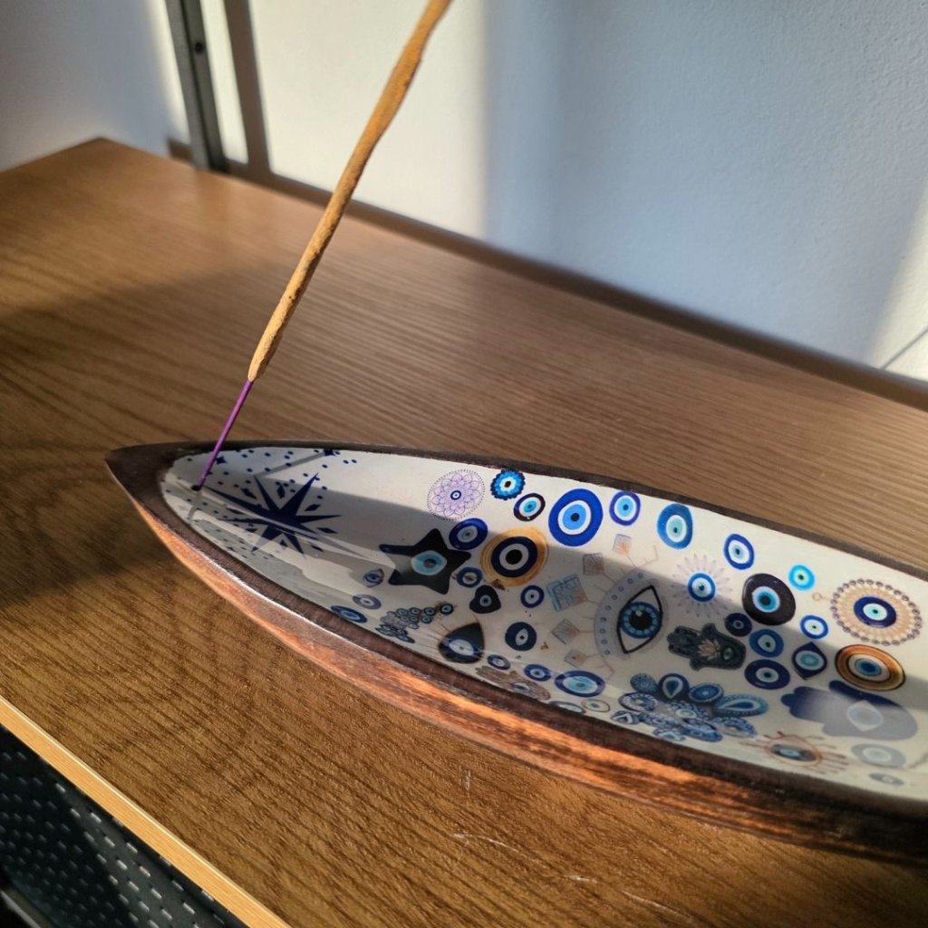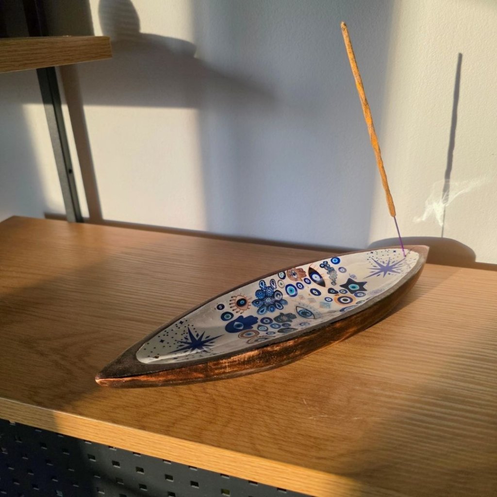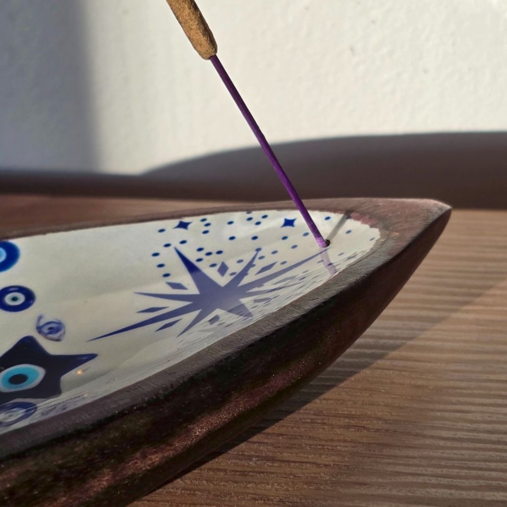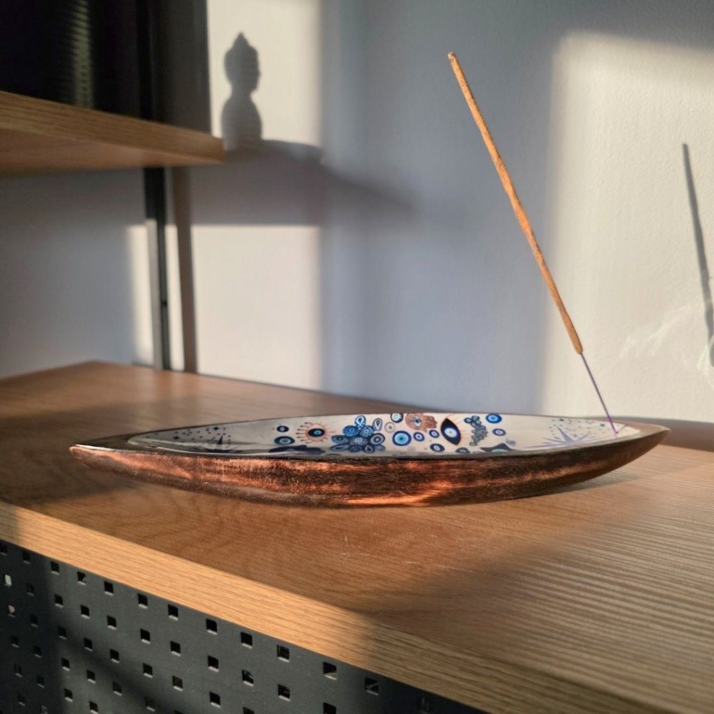 Tato ručně vyrobená mísa na vykuřovadla spojuje přírodní krásu mangového dřeva a praktický smaltovaný vnitřek, který usnadňuje čištění. Vznikla v Indii a nese motiv ochranného oka, jenž je po staletí vnímán jako symbol štěstí a ochrany před negativní energií.