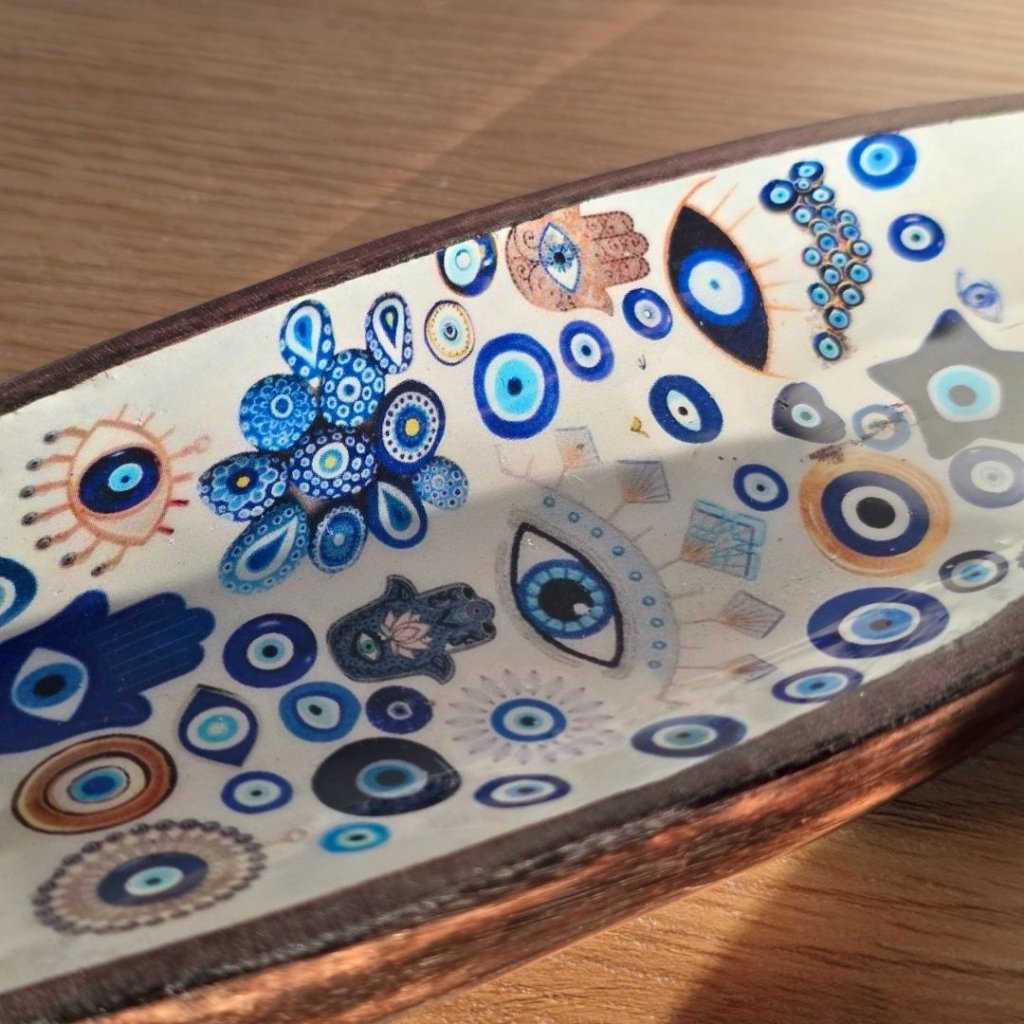 Tradiční symbol známý jako „Evil Eye“ provází lidstvo po tisíce let napříč kulturami od Středomoří až po Indii. Věřilo se, že chrání před závistí a negativní energií, která může oslabovat naše vztahy i vnitřní klid. Umístěný v prostoru působí jako strážce domova, který přitahuje harmonii, rovnováhu a štěstí. Proto je tak oblíbený nejen v rituálech, ale i jako dekorace.