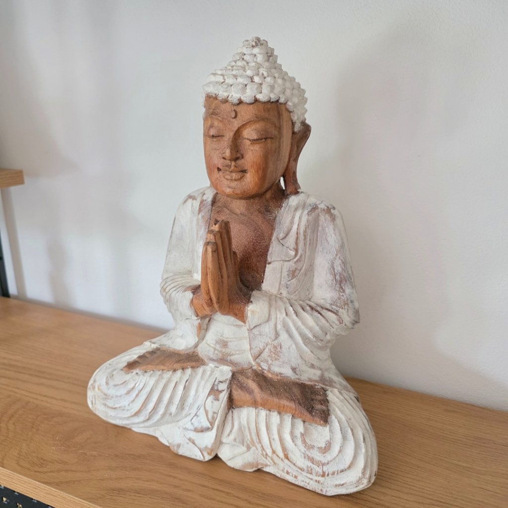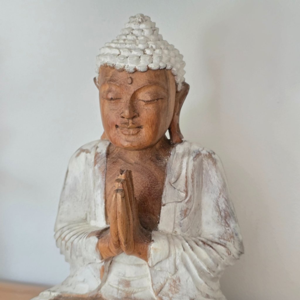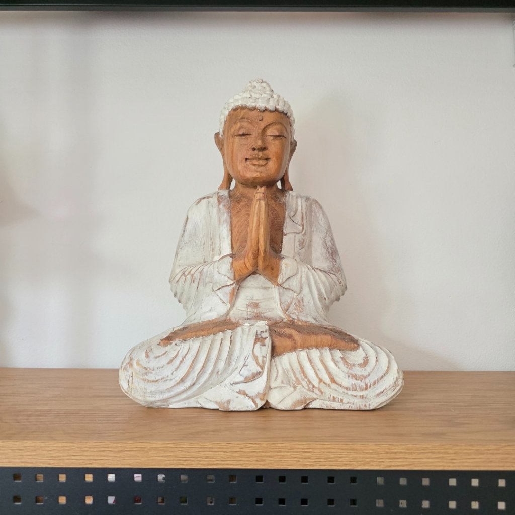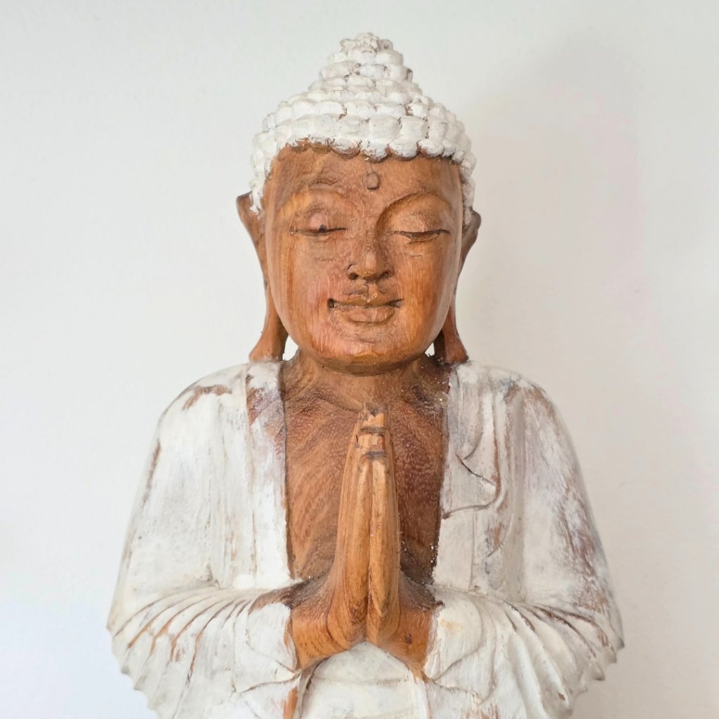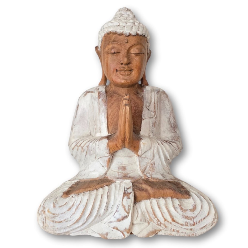 Ručně vyřezávaná soška Buddhy ze suarového dřeva vnese do domova harmonii a klid. Má povrchovou úprava ve stylu bílé patiny, která krásně nechá vyniknout kresbu dřeva. Výška 30 cm z ní dělá výrazný prvek do obýváku, ložnice, meditačního koutku i pracovny. Gesto spojených dlaní vyjadřuje úctu, vděčnost a přivítání.