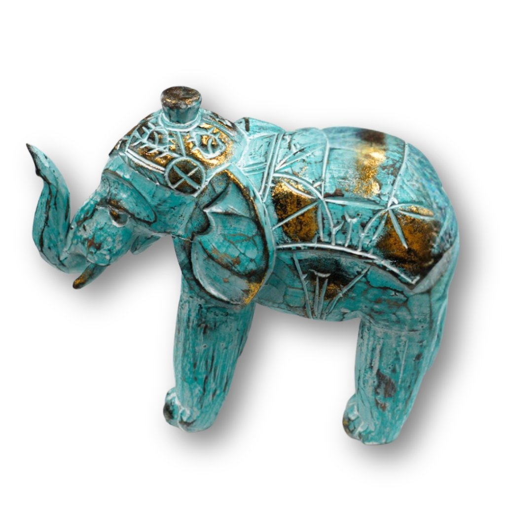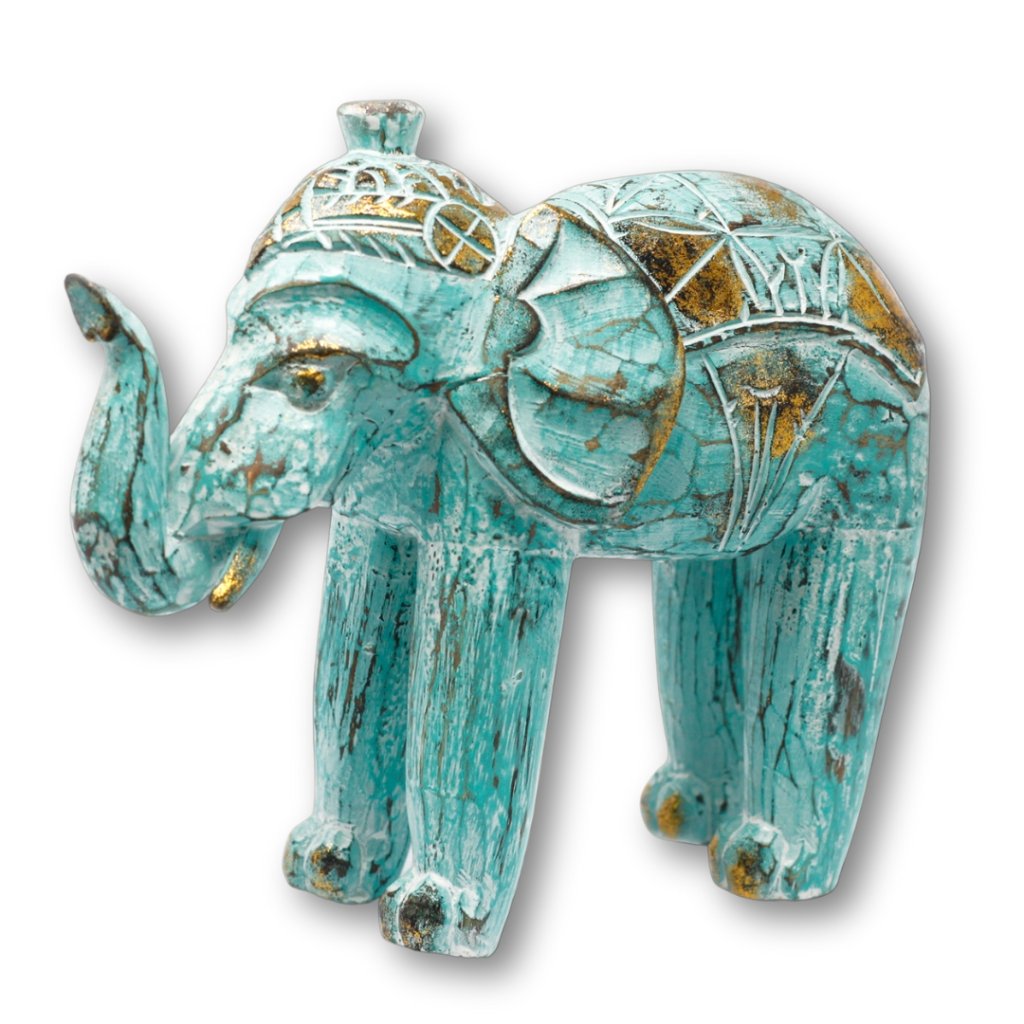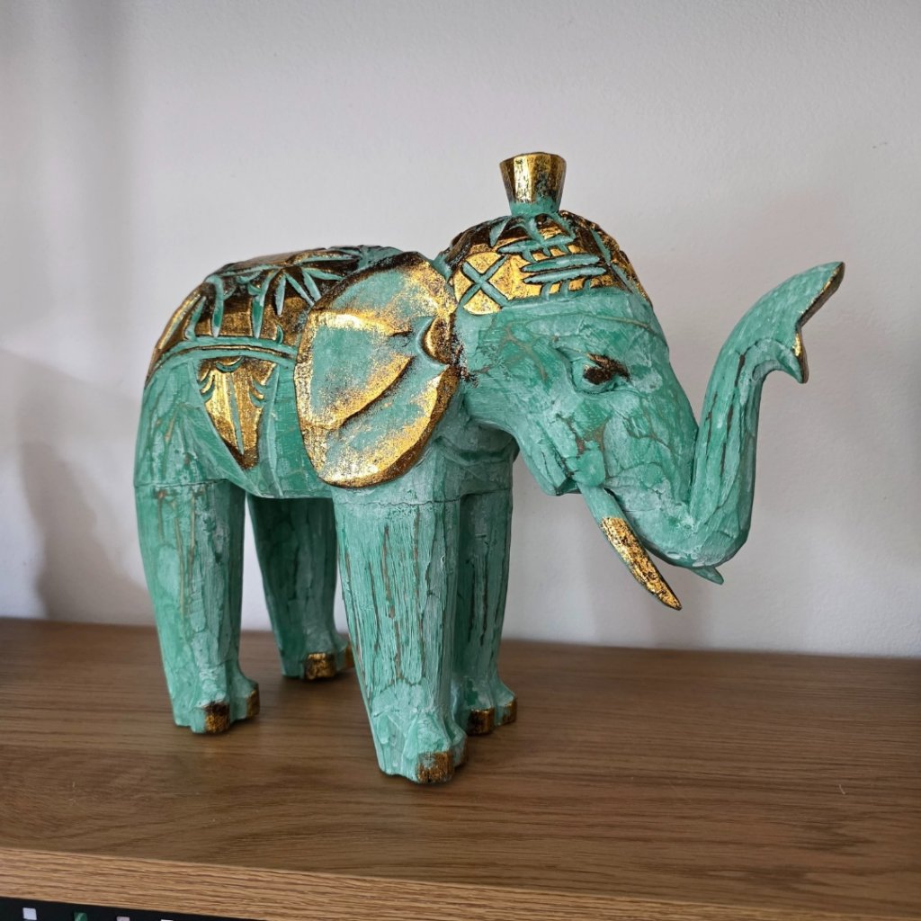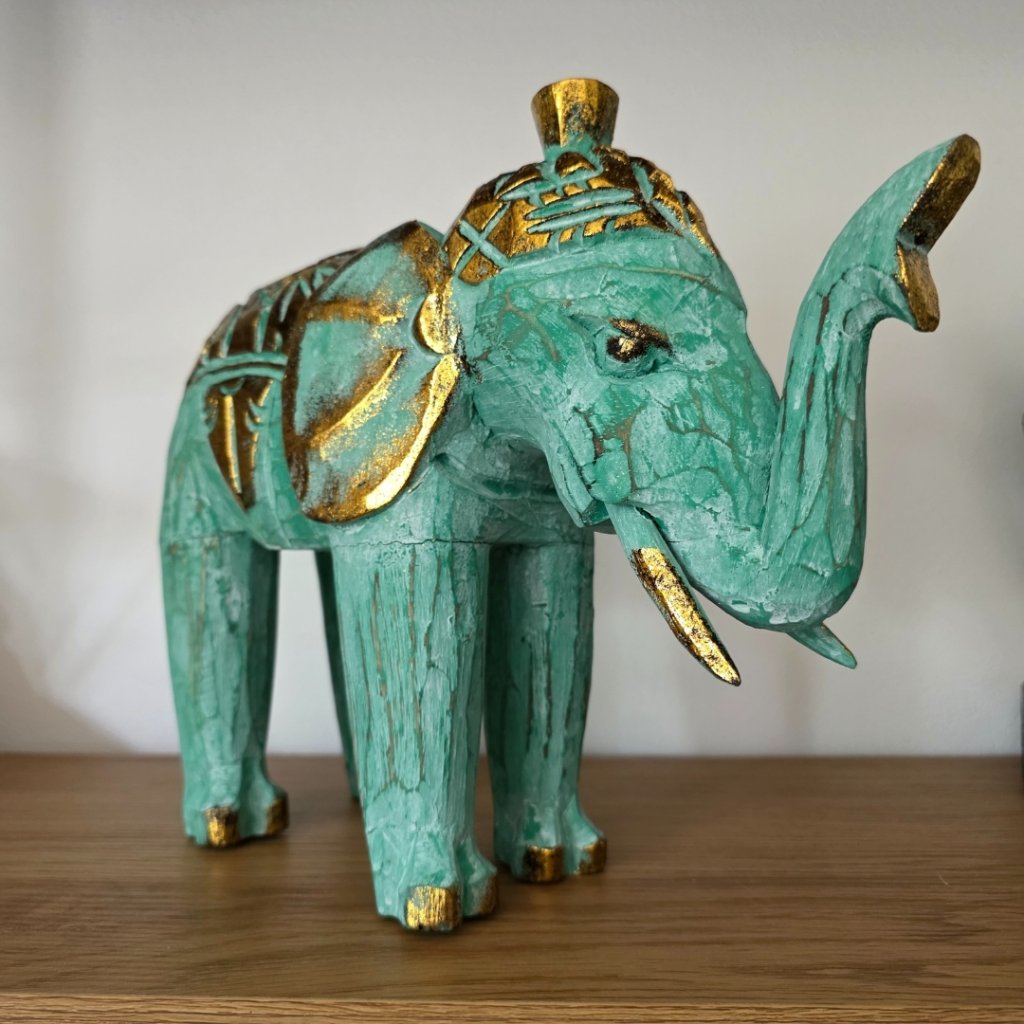 Stylová soška slona s tyrkysovo-zlatou patinou, která vnese do interiéru klid a důstojnost. Ručně vyřezávaný z dřeva albízie (Albesia) na Bali v Indonésii, s jemnými zlatými detaily a lehce „vintage“ vzhledem. Rozměry 27 × 24 × 8 cm, hmotnost cca 1 kg – dostatečně výrazný kousek, ale stále snadno umístitelný na komodu, polici či oltář.