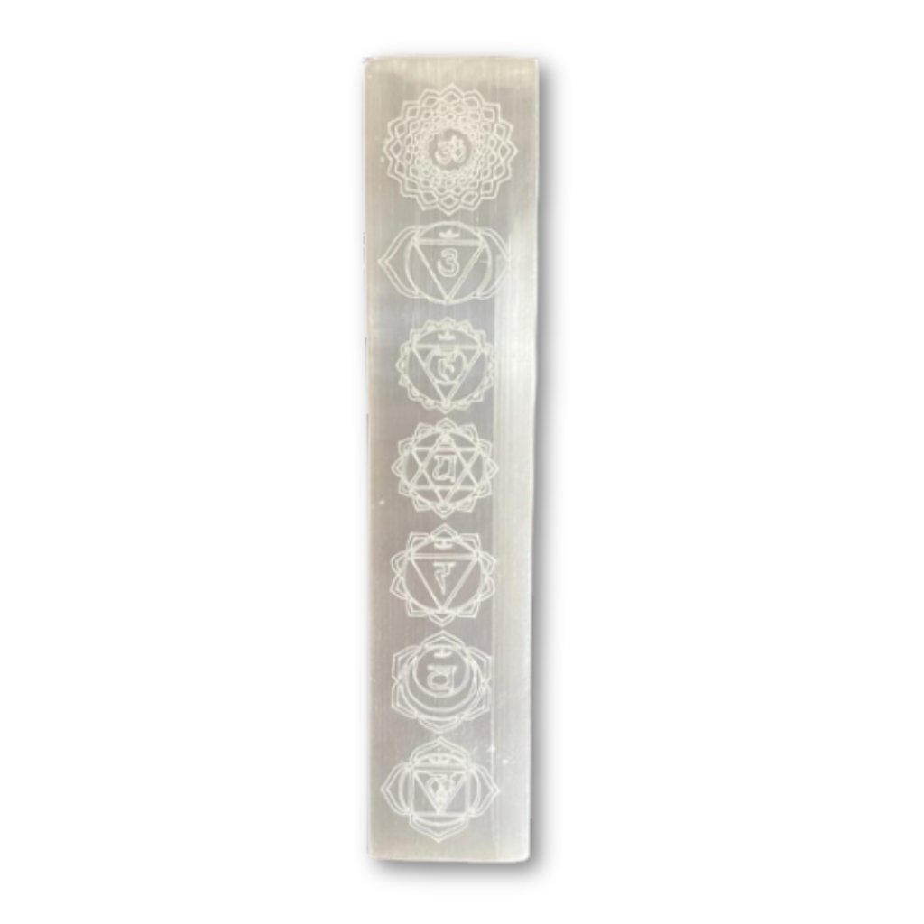 Tento podlouhlý podtácek ze selenitu je nejen krásný dekorativní kousek, ale také praktický pomocník při práci s energií. Na jeho povrchu jsou vyryté symboly sedmi čaker, které připomínají propojení těla, mysli a vnitřního klidu. Díky hladkému, lesklému povrchu působí jemně a elegantně, takže se hodí do každého interiéru.