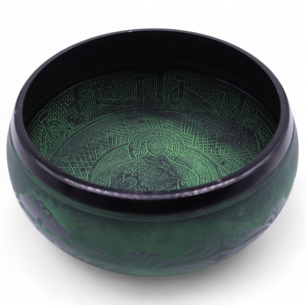 Mísa má mechově zelený povrch s jemnou patinou, která podtrhuje její zemitý charakter. Při rozeznívání vydává hluboké, plné vibrace, které se dobře nesou prostorem a pomáhají vytvořit stabilní, uzemněnou atmosféru. Hodí se pro meditace, zvukové lázně, terapii i práci s přechody během lekcí jógy. Součástí balení není palička.