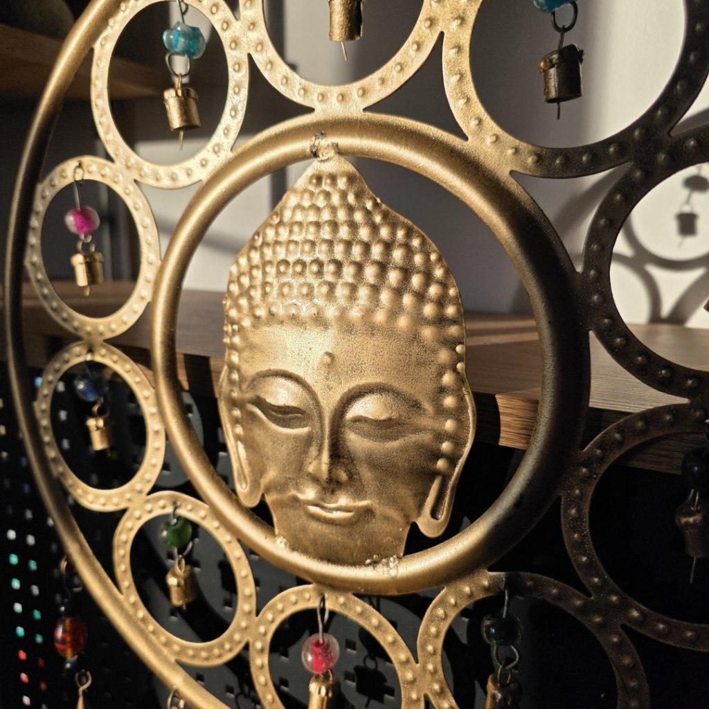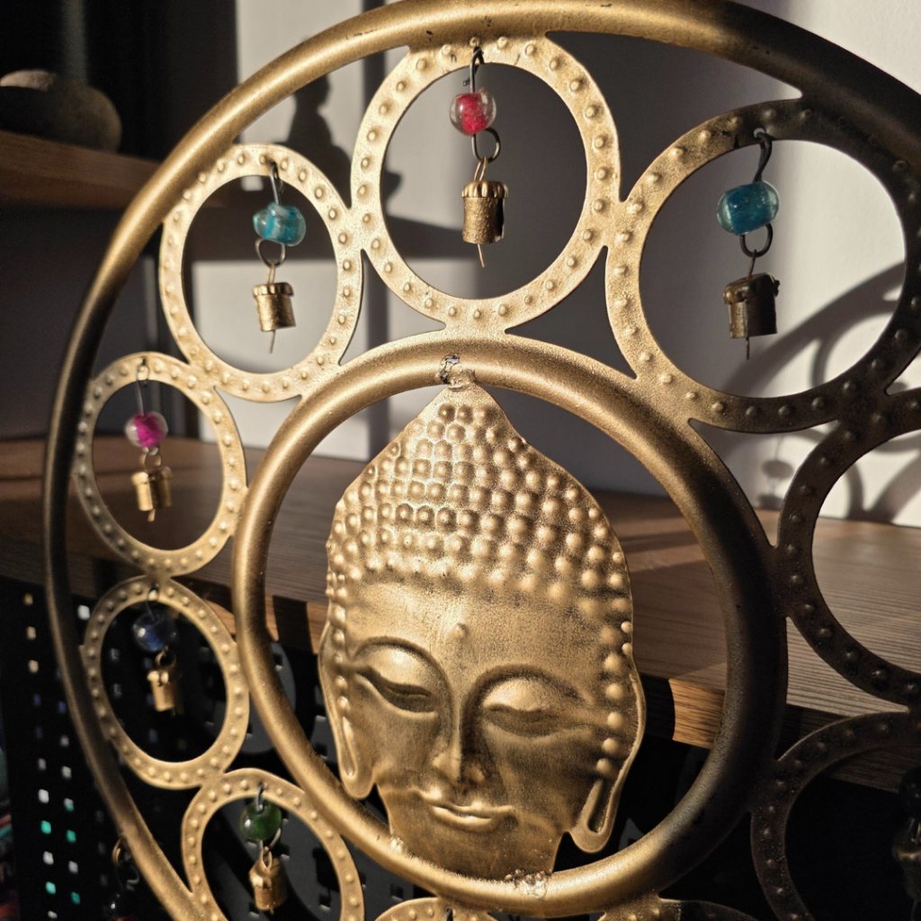 Buddhova tvář symbolizuje vnitřní klid, soucit a bdělou pozornost. V indické a buddhistické tradici připomíná návrat k přítomnému okamžiku. Závěsné zvonky se používají jako jemný zvukový prvek, který krátkým zazvoněním uzavírá jeden okamžik a otevírá další. Spojení obrazu a zvuku vytváří harmonický doplněk prostoru.