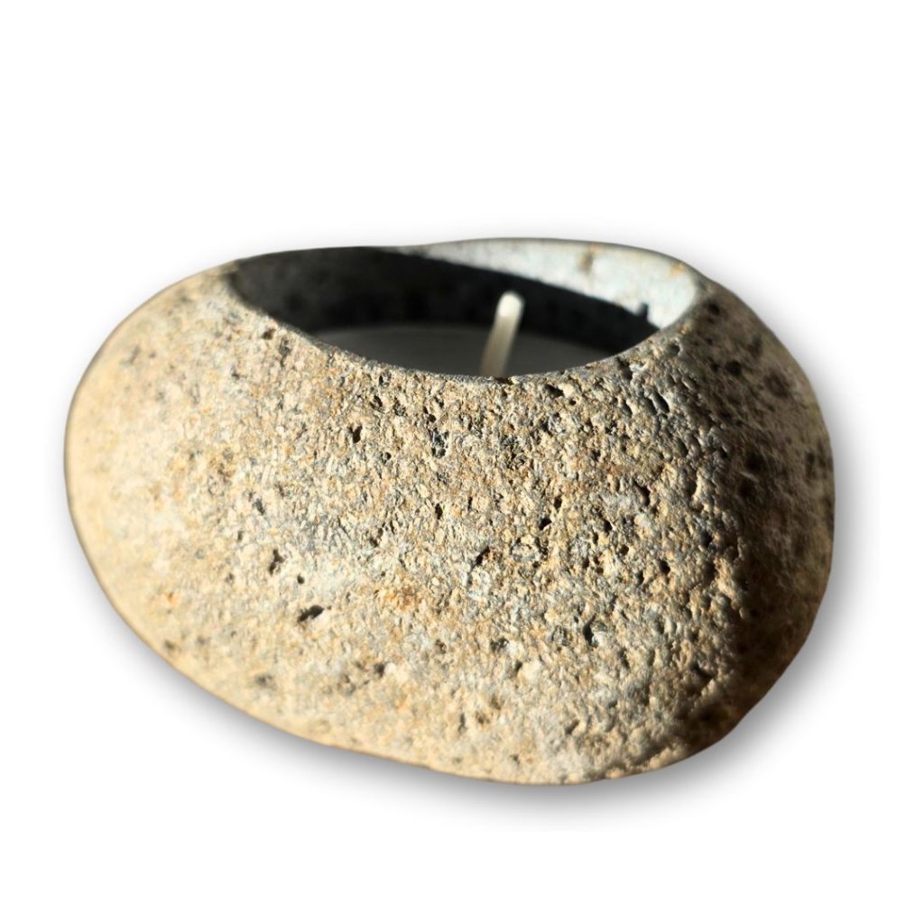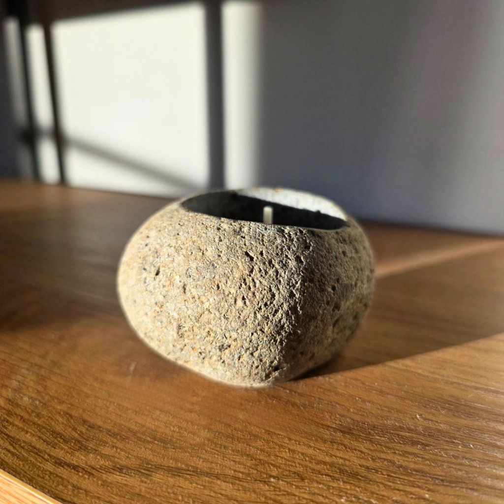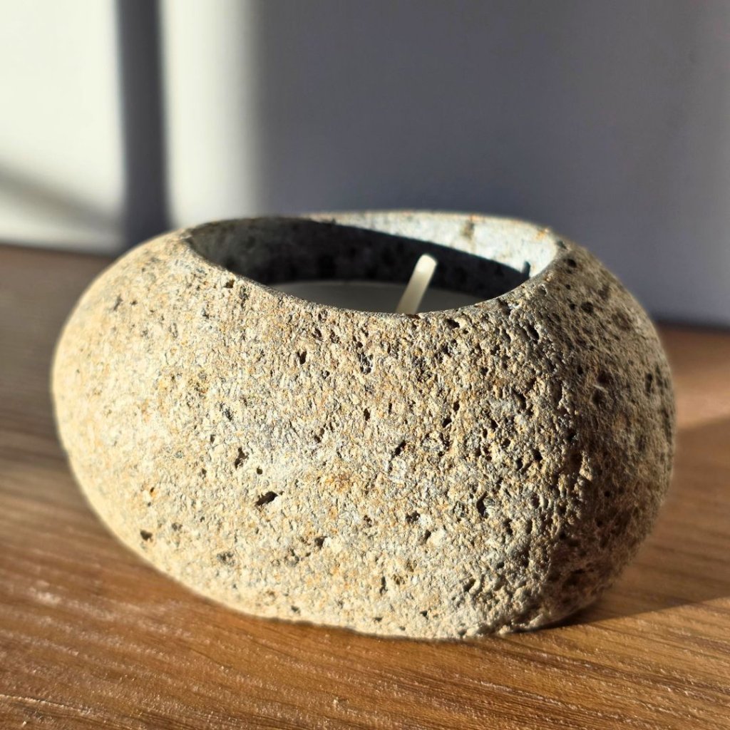 Každý svícen z přírodního říčního kamene je originál vytvořený samotnou přírodou. Kámen byl po dlouhá léta tvarován proudem vody, který mu dal jeho jemně zaoblený tvar, přirozenou strukturu i barevné odstíny. Po opracování vzniká jednoduchý, ale výrazný svícen pro jednu čajovou svíčku, který do prostoru přináší klidnou, zemitou atmosféru.