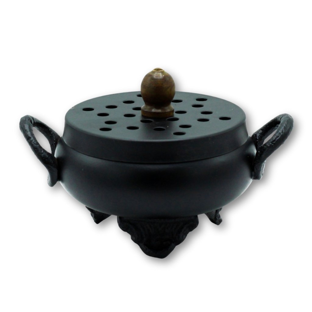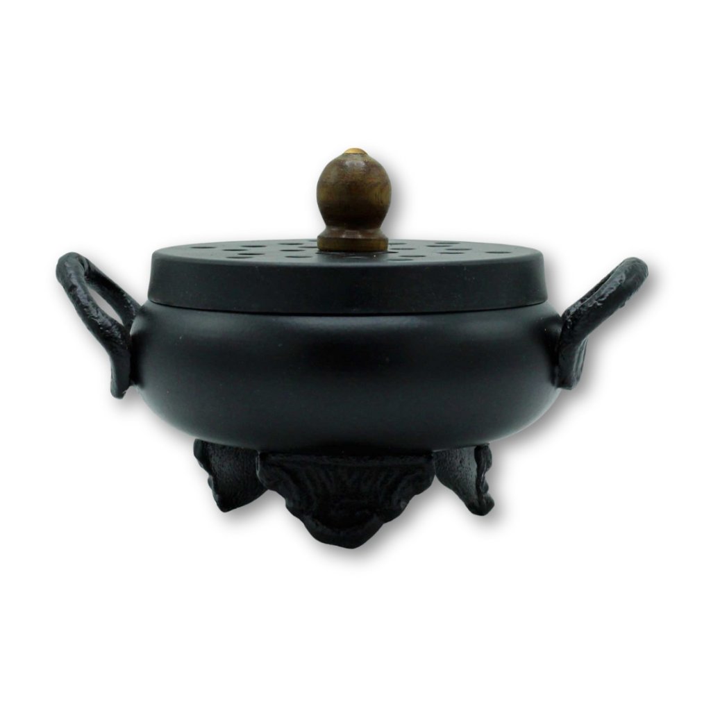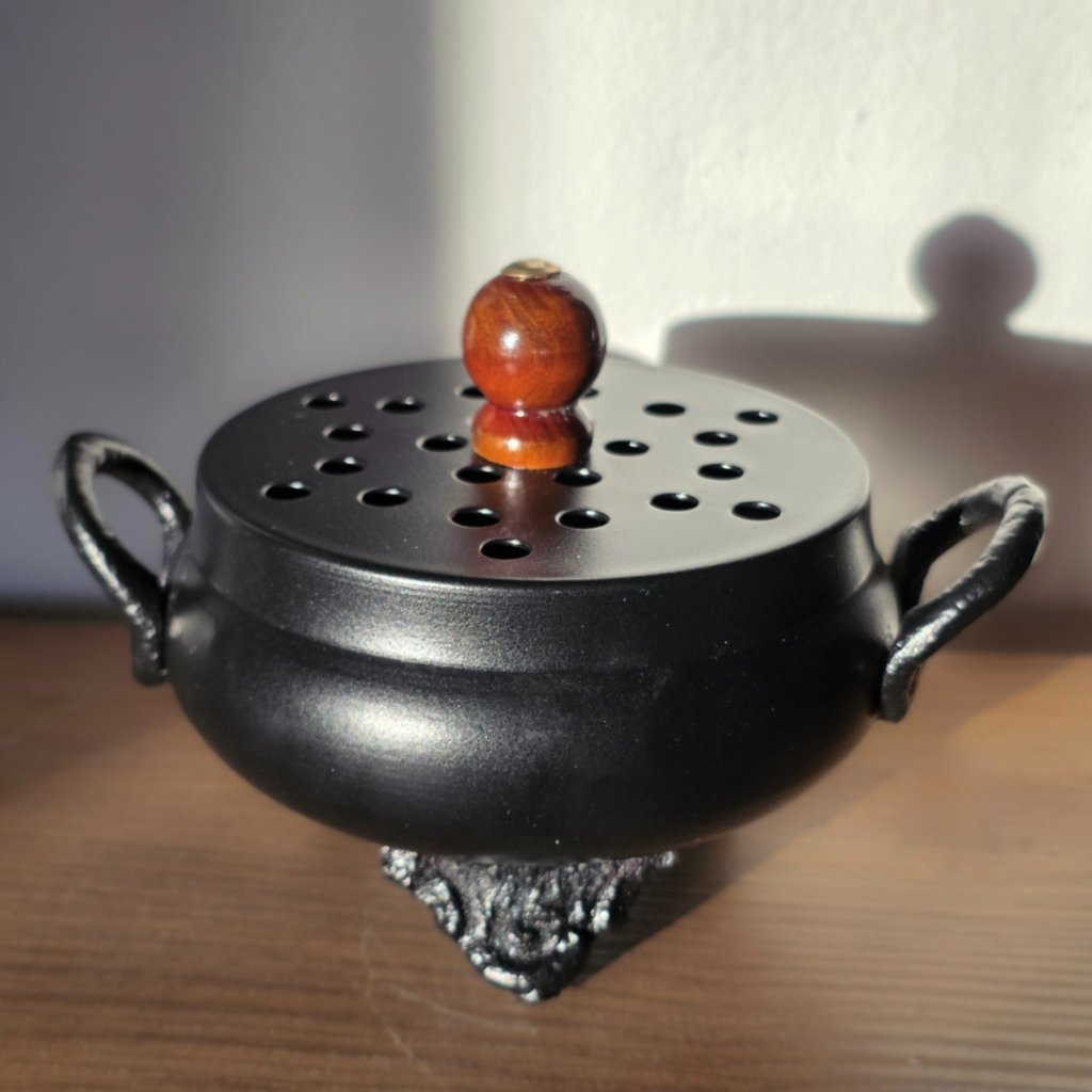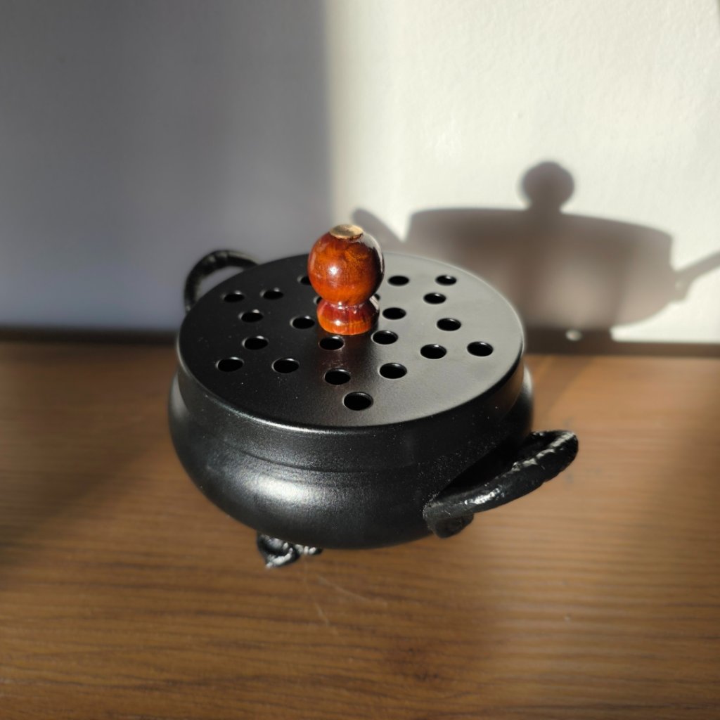 Tahle kadidelnice ve tvaru malého litinového kotlíku působí minimalisticky, funkčně a poctivě. Žádný dekor navíc, jen černý kov, stabilní nožky a perforované víko, které nechá kouř pomalu a přirozeně unikat. Přesně ten typ kadidelnice, který má v sobě sílu ohně a klid rituálu. Pochází z Indie a je určená na vykuřování pryskyřic, bylin i směsí na uhlíku.