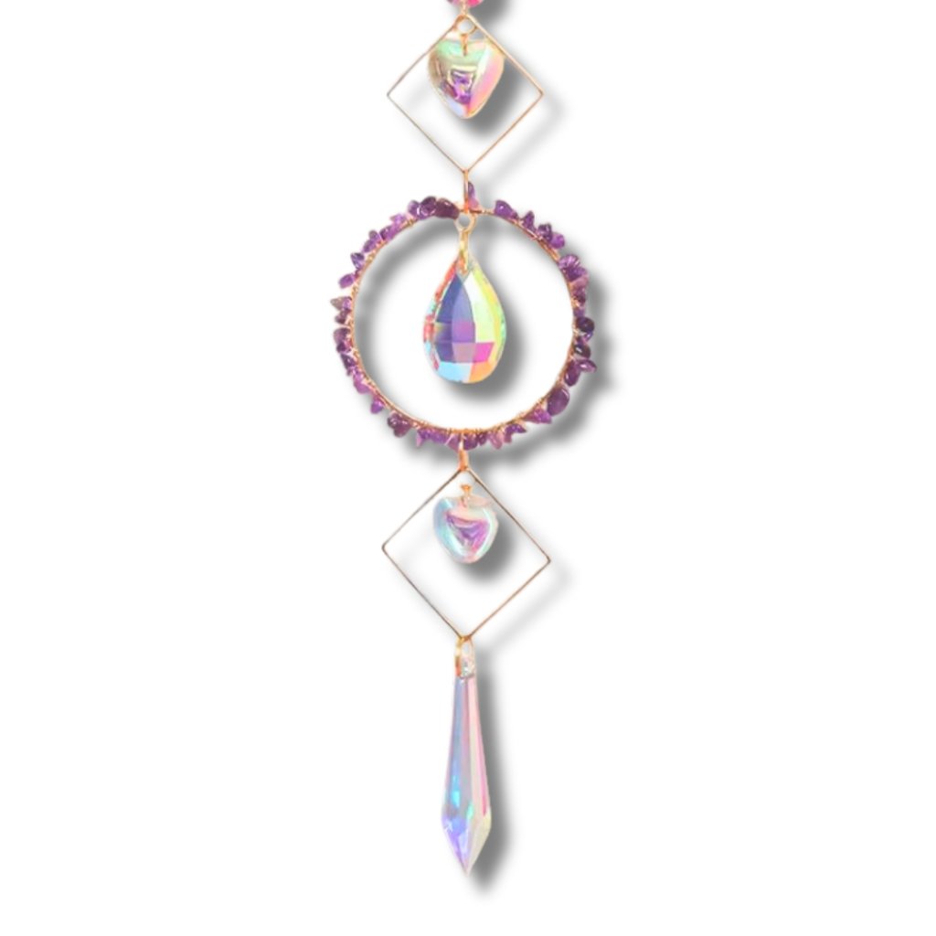 Přineste do svého domova třpyt slunečních paprsků a klidnou energii ametystu s tímto nádherným lapačem slunce. Ručně vyráběný kousek kombinuje broušené skleněné prvky a drobné kamínky ametystu, které při dopadu světla vytvářejí kouzelné duhové odlesky. Jeho jemná energie podporuje harmonii a optimální Feng Shui, ať už ho zavěsíte do okna, na verandu nebo do meditačního koutku.
