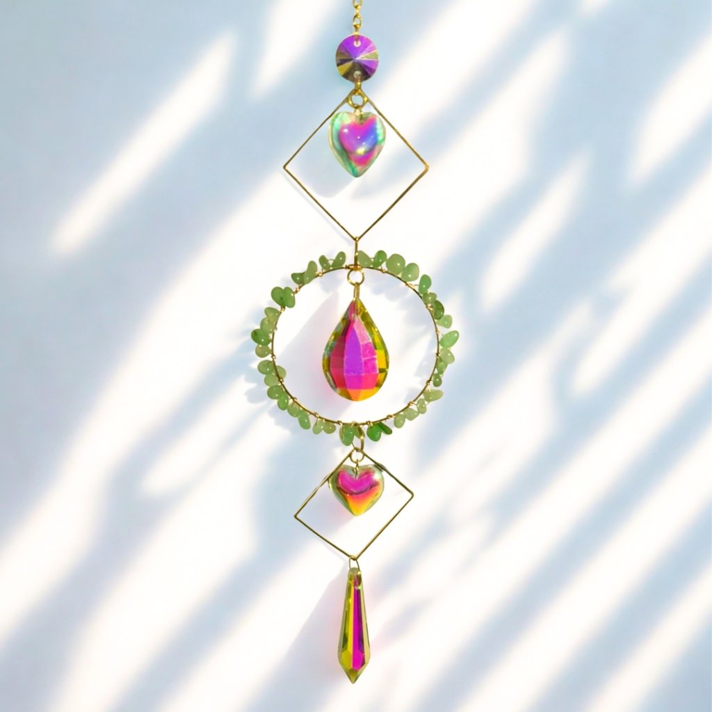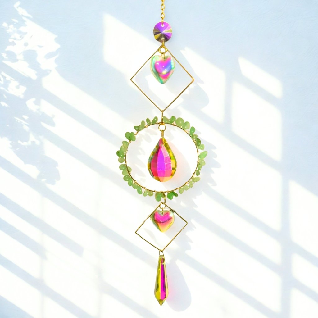 Přineste do svého domova třpyt slunečních paprsků a jemnou energii avanturínu s tímto nádherným lapačem slunce. Ručně vyráběný kousek kombinuje broušené skleněné prvky a drobné kamínky avanturínu, které při dopadu světla hrají zelenými odlesky. Jeho energie podporuje klid, štěstí a optimální Feng Shui, ať už ho zavěsíte do okna, na verandu nebo do svého oblíbeného koutku.