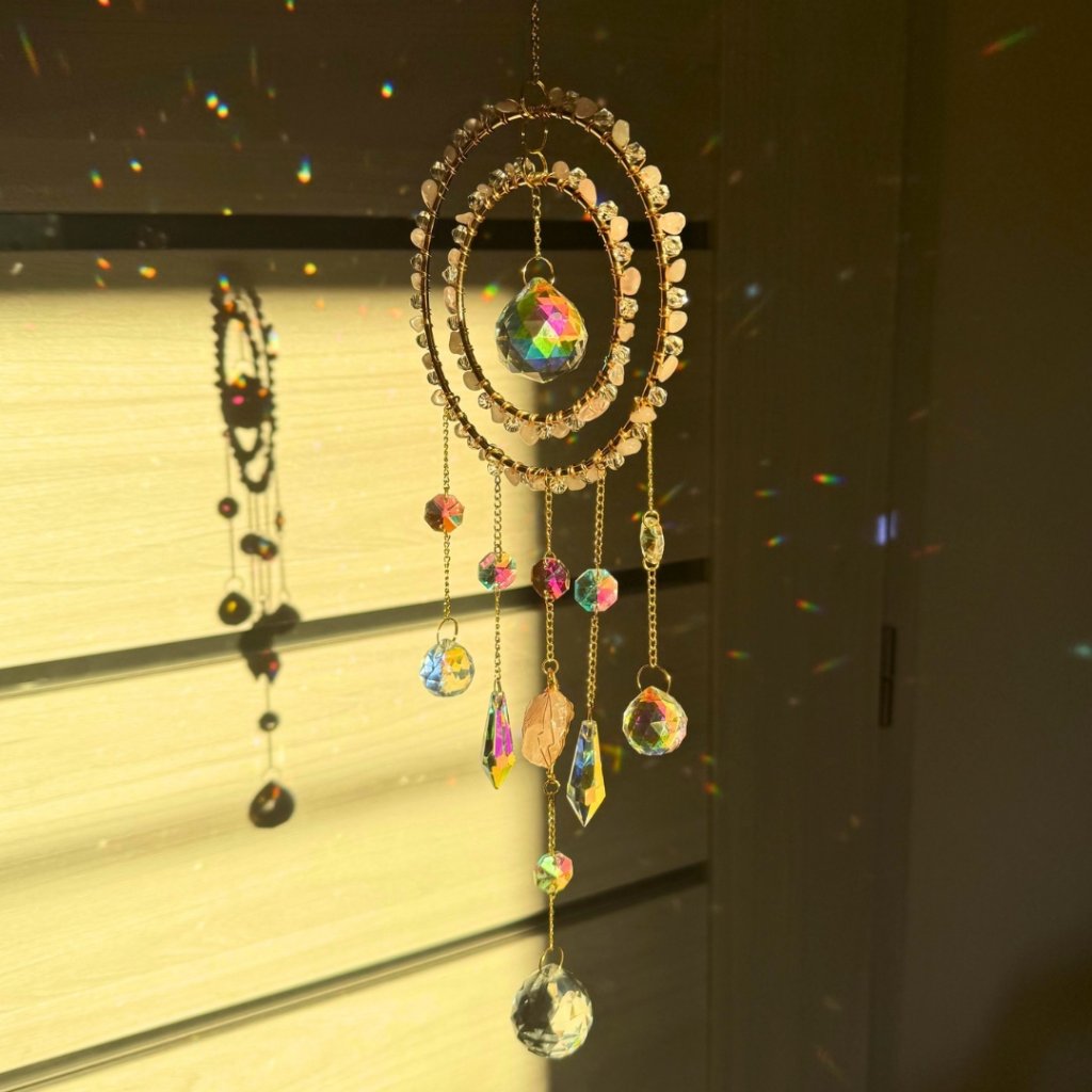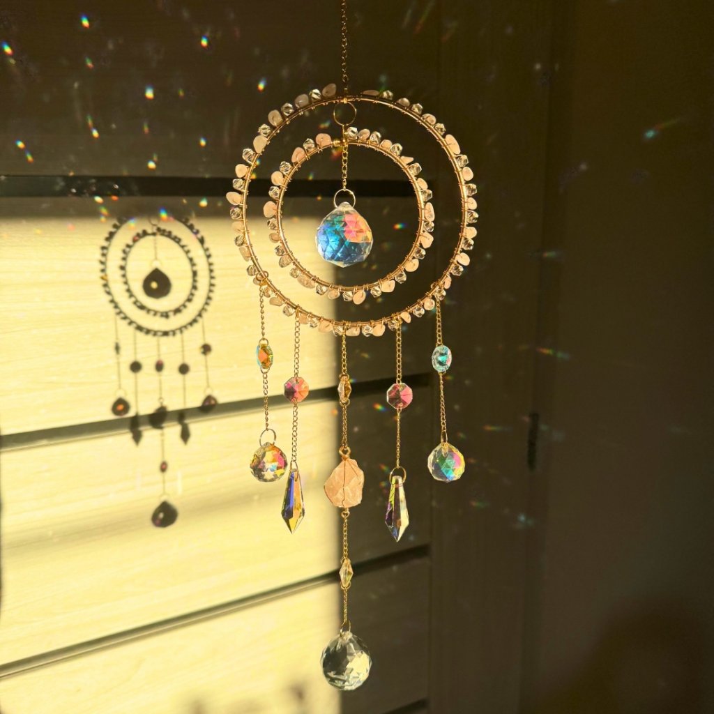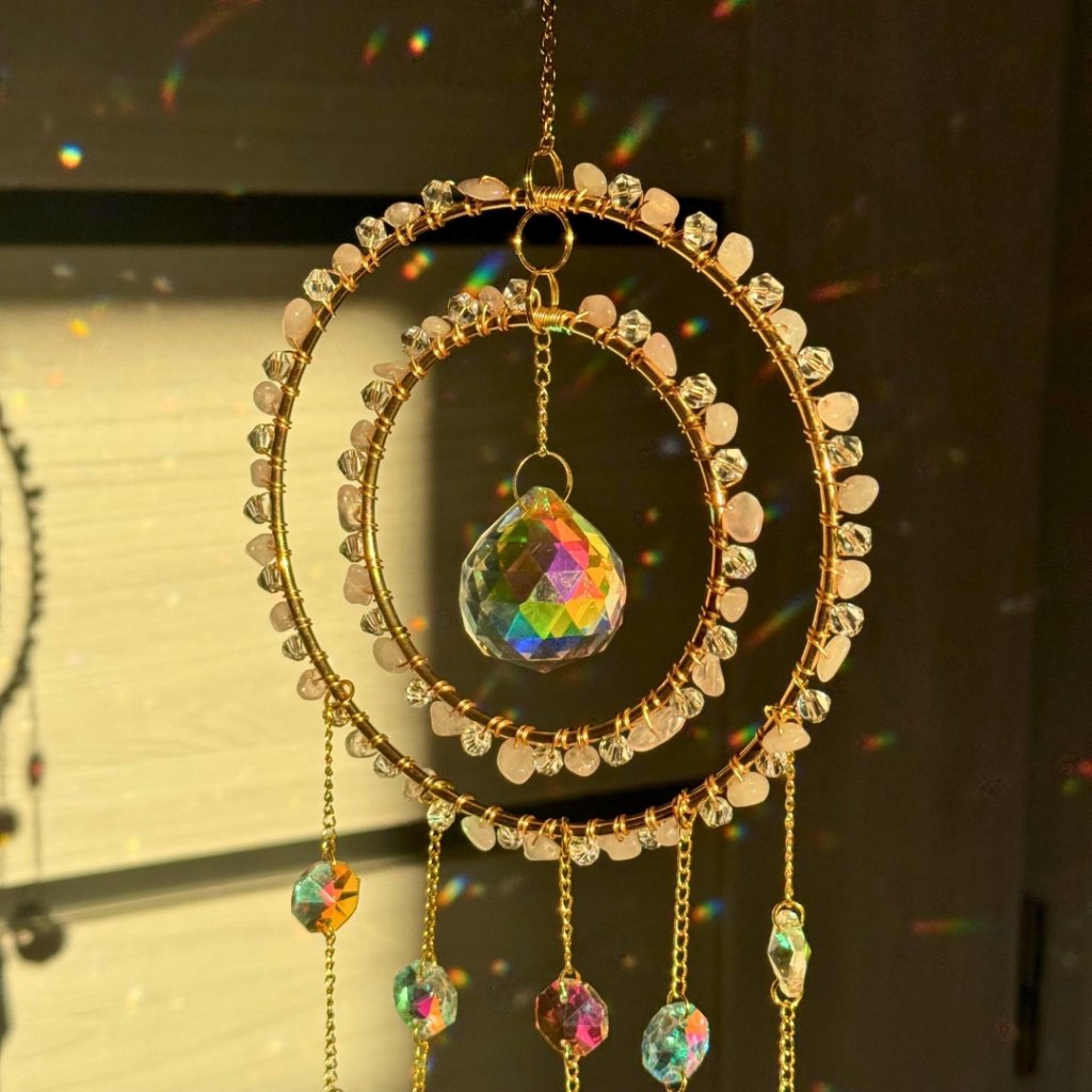 Přineste do svého domova jemnou energii lásky a harmonii s tímto elegantním lapačem slunce. Dva kruhy zdobené drobnými kamínky růženínu a broušenými skleněnými prvky vytvářejí při dopadu světla kouzelné barevné odlesky. Ve středu se třpytí zavěšený broušený ověs, který rozptyluje světlo do prostoru, a spodní část zdobí surový růženín doplněný dalšími broušenými závěsy. Jeho design podpoří optimální Feng Shui a vnese do interiéru klid, světlo a pozitivní atmosféru.