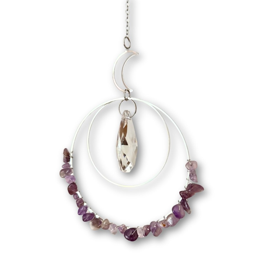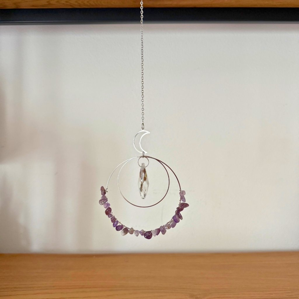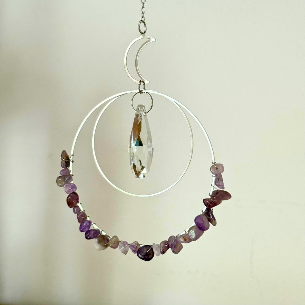 Na zavěšení do okna, na terasu, s ametystem, průměr většího kruhu 8,5 cm, délka cca 33 cm, Feng Shui energie.