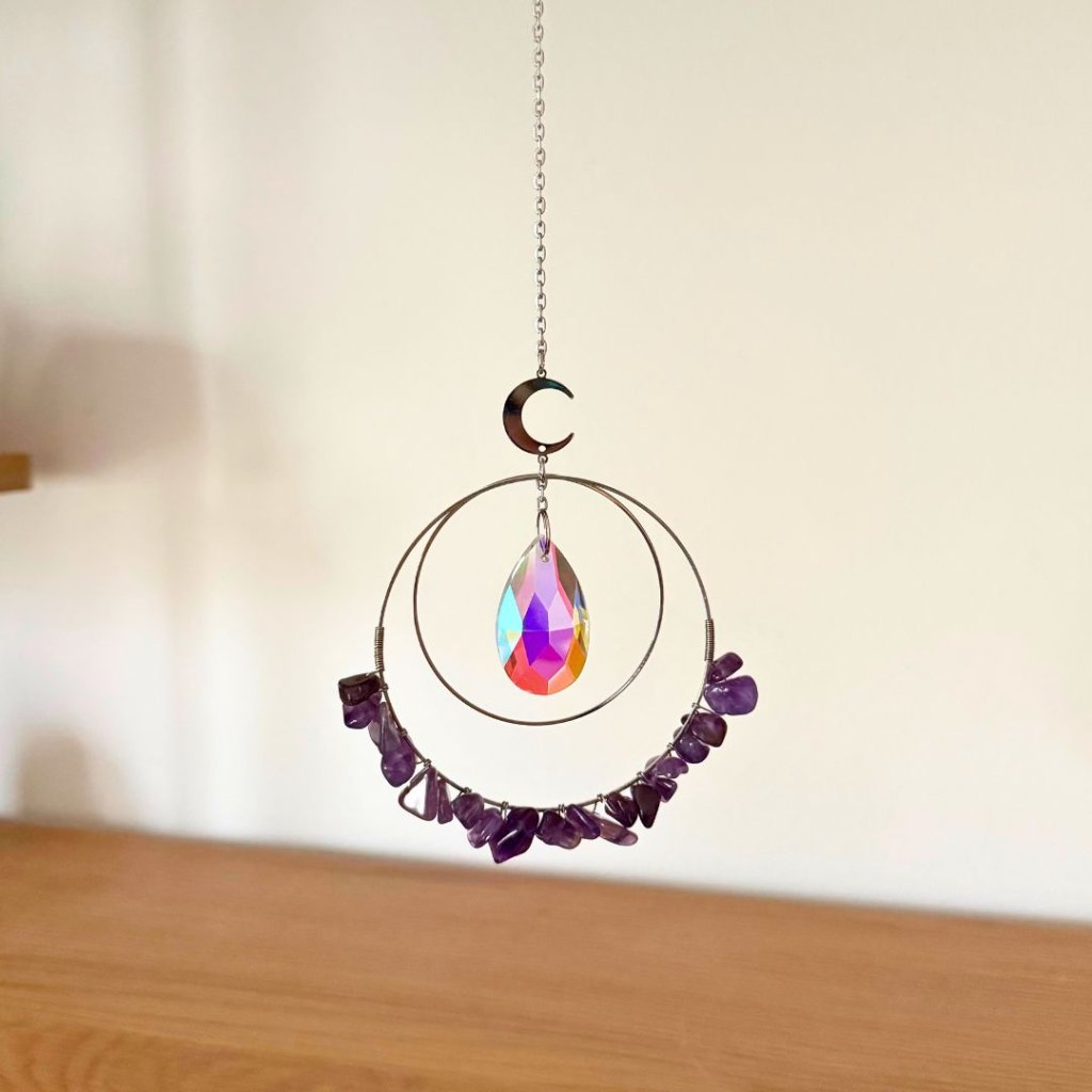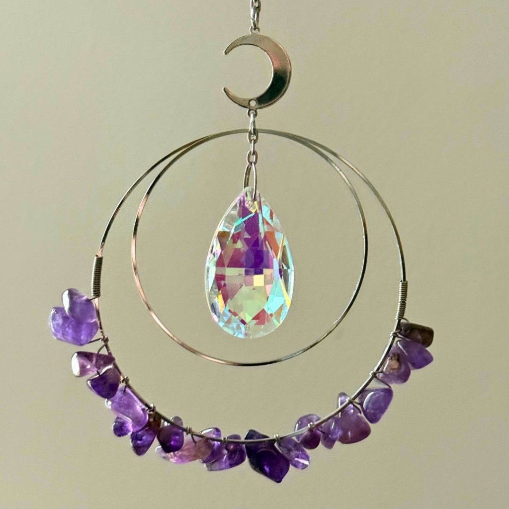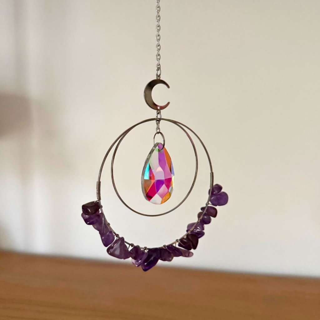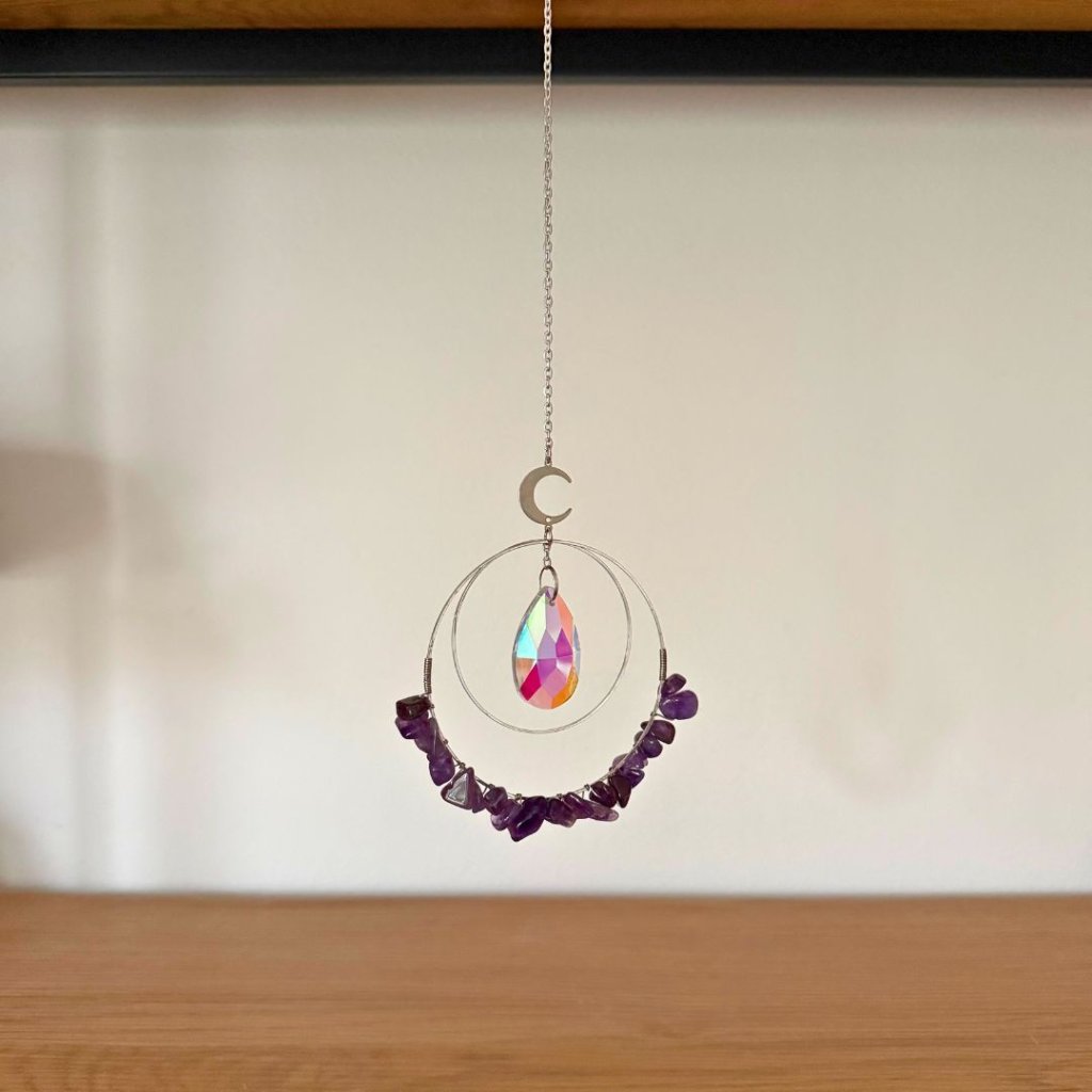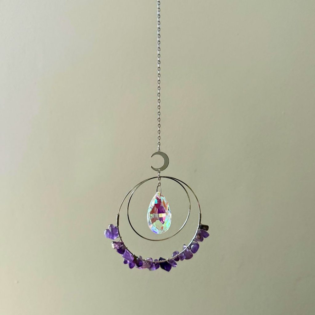 Lapač slunce brána intuice a klidu propojuje světlo, jemnost ametystu a symboliku kruhů do dekorace, která během dne proměňuje atmosféru prostoru. Dvojitý stříbrný kruh zdobený drobnými kamínky ametystu doplňuje broušený krystal zavěšený uprostřed, který zachytává sluneční paprsky a rozptyluje je do místnosti v podobě jemných duhových odlesků. Celek působí lehce, klidně a přirozeně projasní každý prostor.