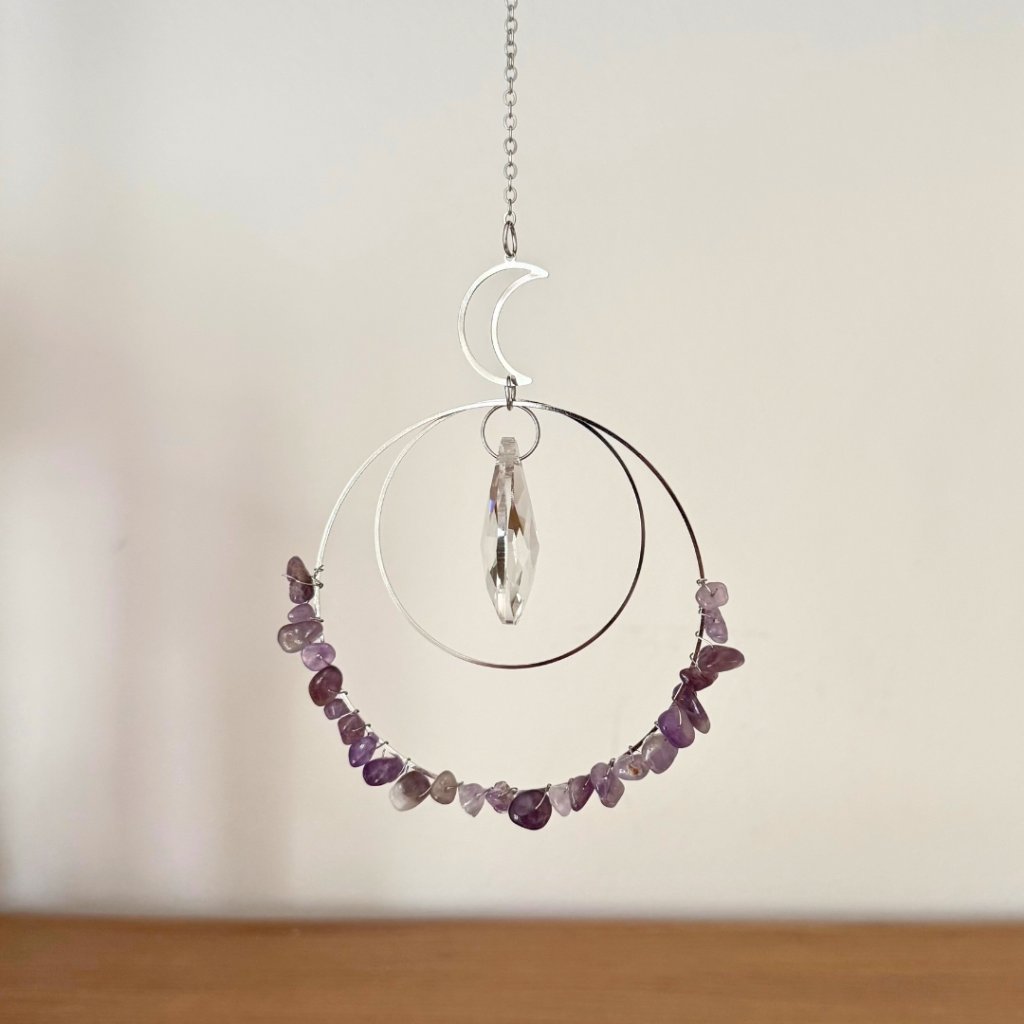 - Propojení s energií světla – Sluneční paprsky procházející lapačem zvýrazňují fialové odstíny ametystu a zesilují jeho uklidňující a harmonizační účinky.