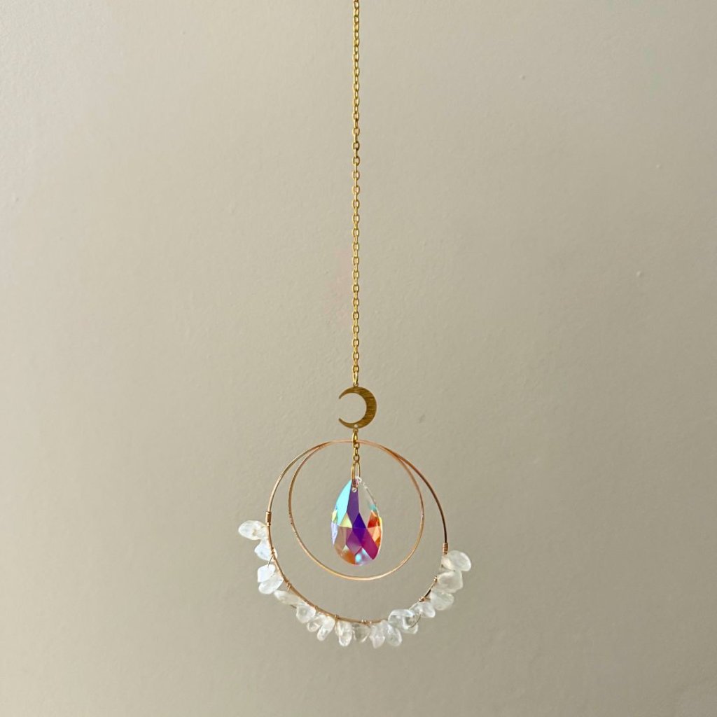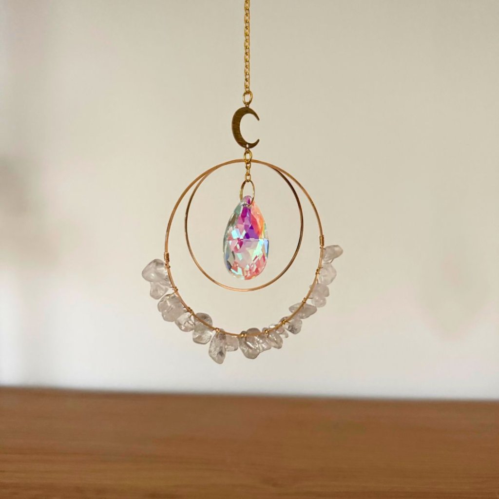 Lapač slunce brána očisty a harmonizace propojuje světlo, čistotu křišťálu a symboliku kruhů do dekorace, která během dne proměňuje atmosféru prostoru. Dvojitý zlatý kruh zdobený drobnými kamínky křišťálu doplňuje broušený krystal zavěšený uprostřed, který zachytává sluneční paprsky a rozptyluje je do místnosti v podobě jemných duhových odlesků. Celek působí lehce, svěže a přirozeně projasní každý prostor.
