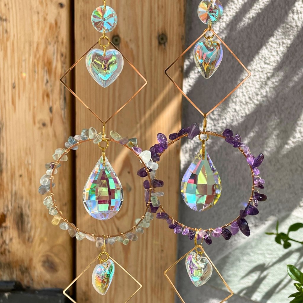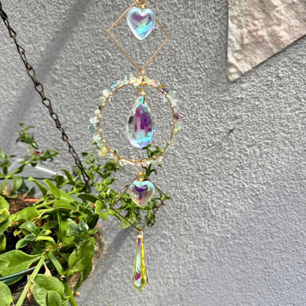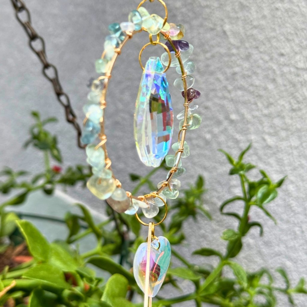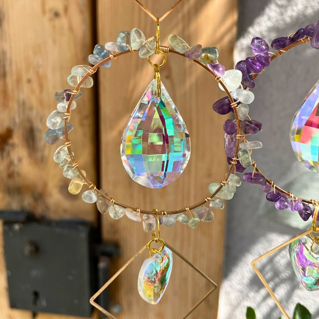 Přineste do svého domova třpyt slunečních paprsků a svěží energii fluoritu s tímto nádherným lapačem slunce. Ručně vyráběný kousek kombinuje broušené skleněné prvky a drobné kamínky fluoritu, které při dopadu světla vytvářejí jemné barevné odlesky. Jeho energie podporuje harmonii a optimální Feng Shui, ať už ho zavěsíte do okna, na verandu nebo do meditačního koutku.