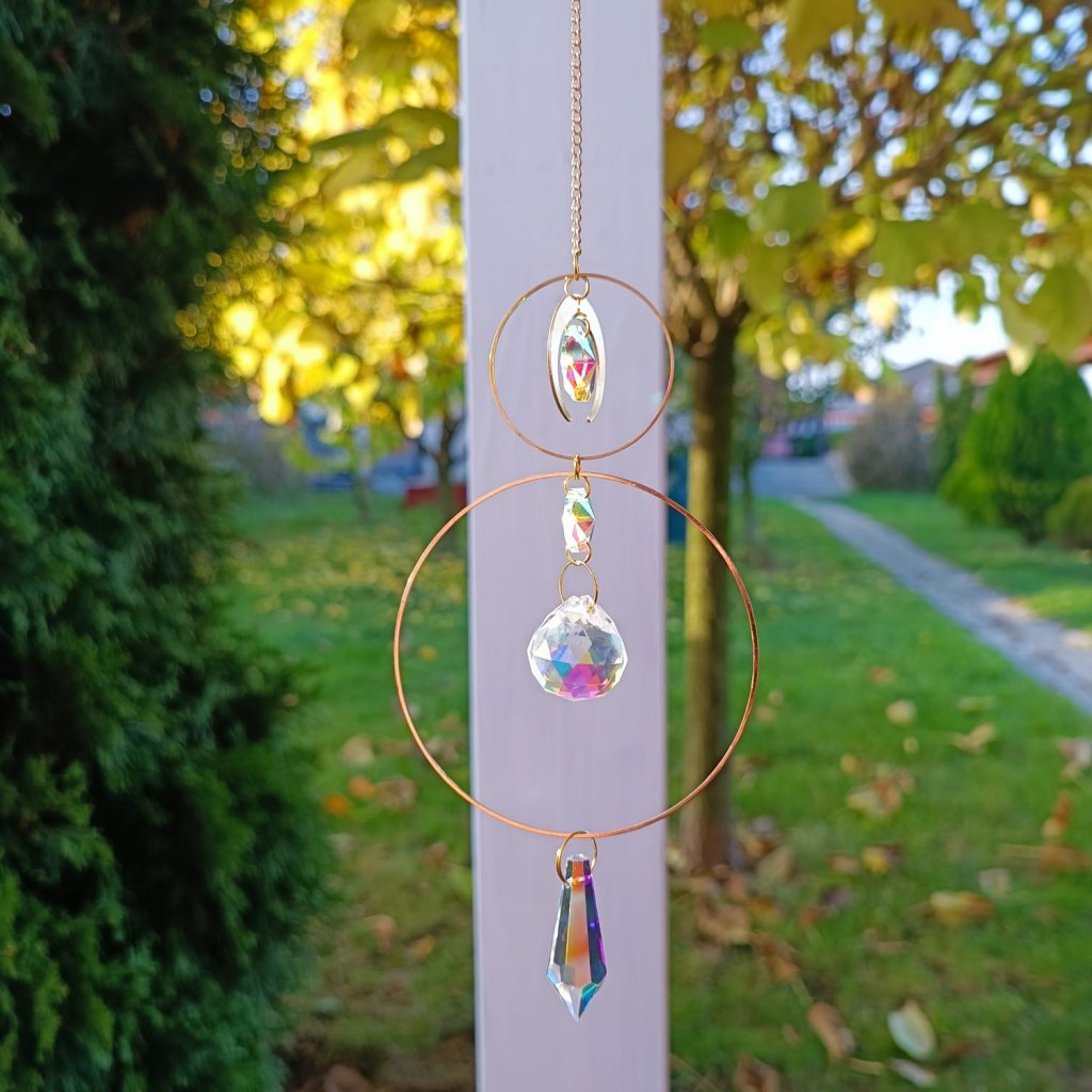 Na zavěšení do okna, na terasu, průměr většího kruhu 8 cm, menšího kruhu 4 cm, délka cca 40 cm, Feng Shui energie.