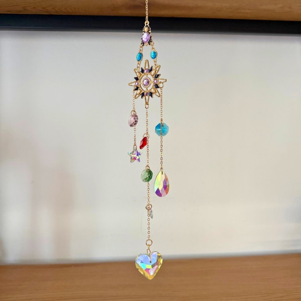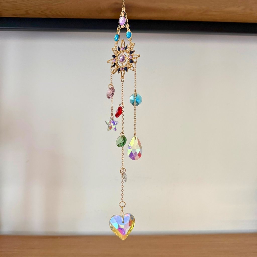 V centru celého lapače je hvězda – výrazná, detailně propracovaná, obklopená komponenty v různých tvarech a barvách. Když na ni dopadne světlo, rozloží ho do prostoru a vytvoří jemnou hru odlesků, která mění náladu místnosti. Spodní část uzavírá broušené skleněné srdce, které zachytává světlo a vytváří silný vizuální bod celého lapače. Každá barevná část v sobě nese jinou energii – dohromady ale fungují jako celek, který prostor zjemňuje, otevírá a projasňuje.