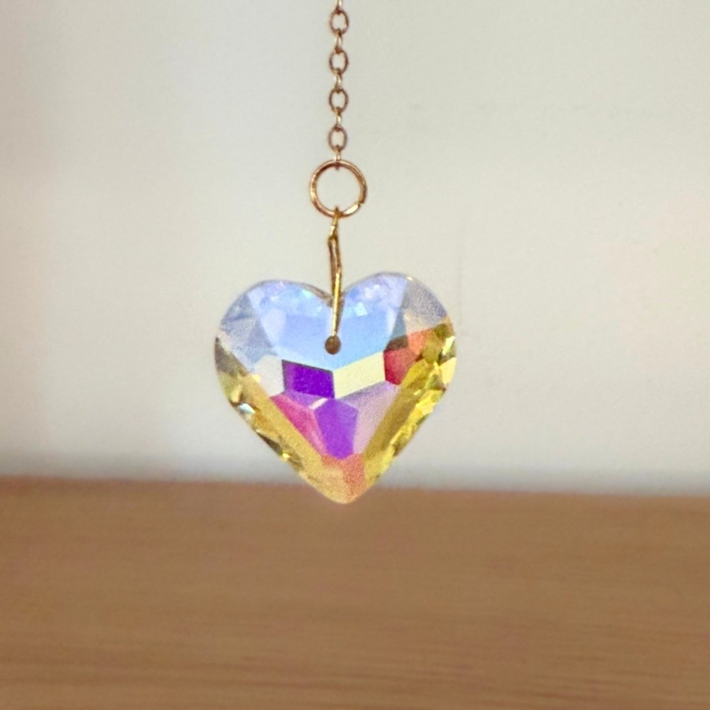 Lapač je zavěšený na jemném řetízku a tvoří jej kombinace několika broušených skleněných prvků. Velké broušené srdce ve spodní části funguje jako optický magnet – lomí světlo do jemných duhových efektů a zároveň působí jako symbol otevřenosti, rovnováhy a propojení. Celek je lehký, vizuálně výrazný a přitom decentní, vhodný do jakéhokoliv prostoru. Lapač jednoduše zavěsíte pomocí praktického háčku na jeho konci.