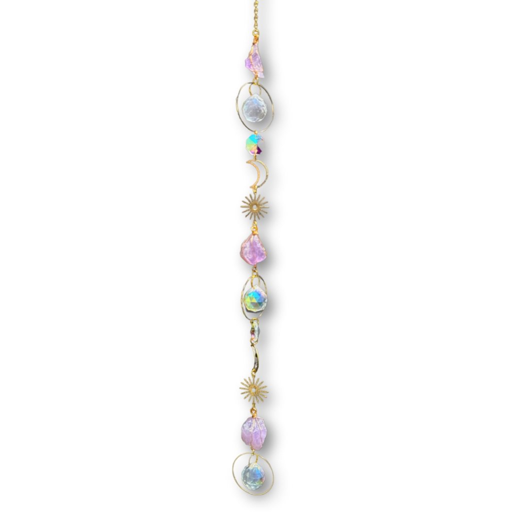 Lapač slunce – Měsíční průvodce s ametystem, symboly hvězd, měsíce, délka 64 cm