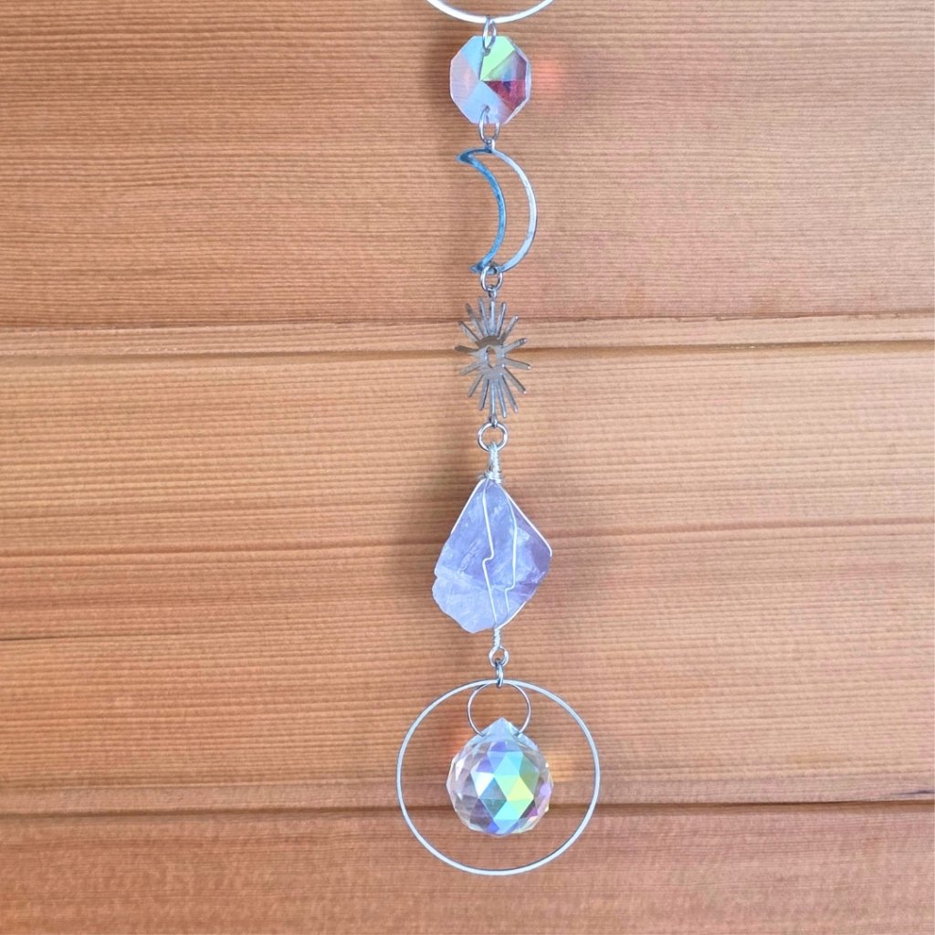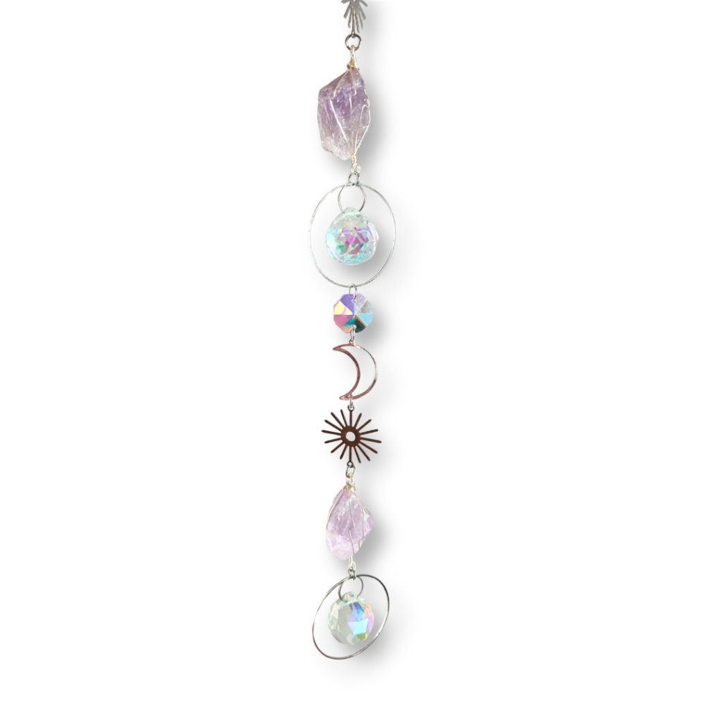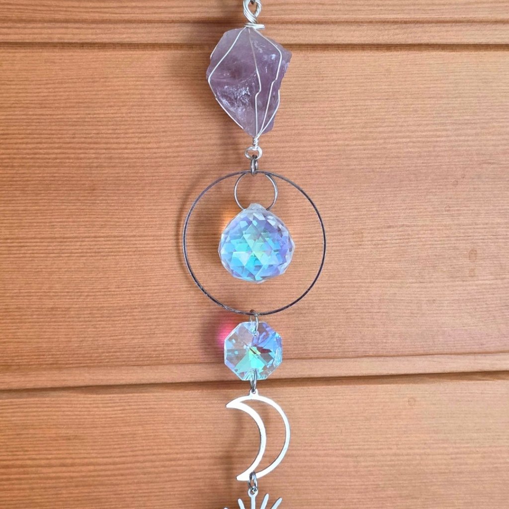 Některé předměty si nepotřebují říkat o pozornost. Září, i když mlčí. Tenhle lapač v sobě nese jemnost, pohyb a světlo. Kombinuje krystaly s přirozenou krásou ametystu a symboly, které odedávna vedly naše kroky: hvězdy a měsíc. Zavěste ho tam, kde bude moci zářit, a nechte ho vnést do vašeho domova klid a harmonii.