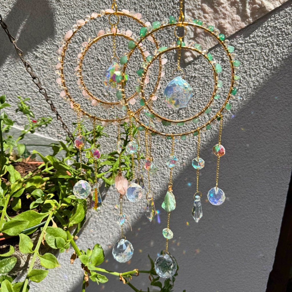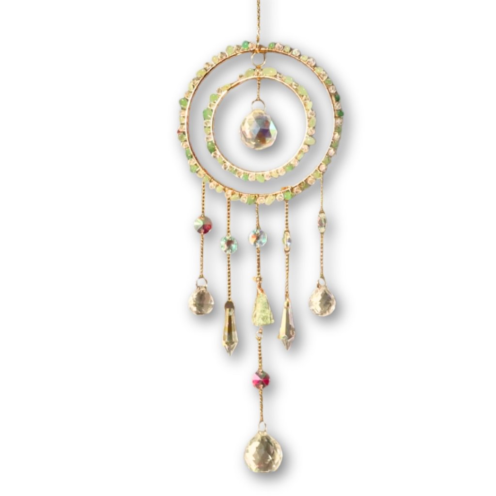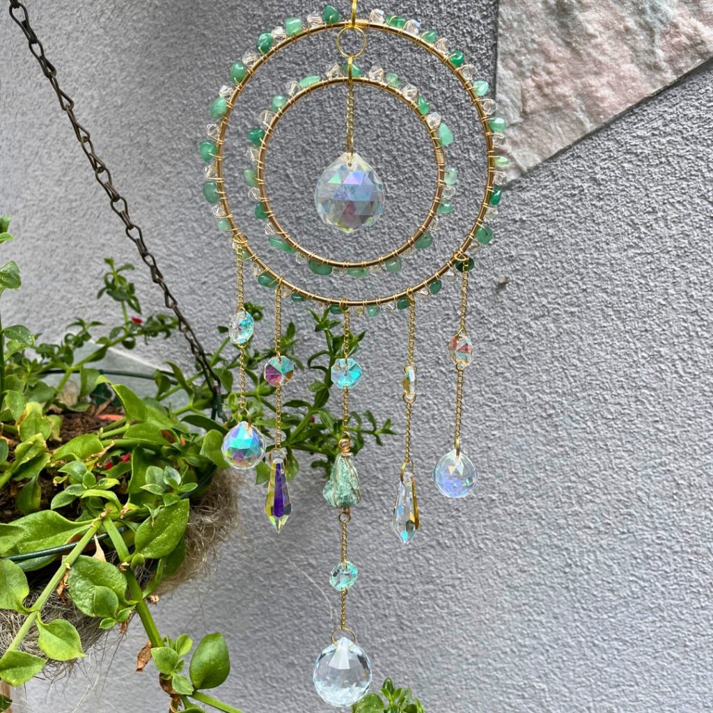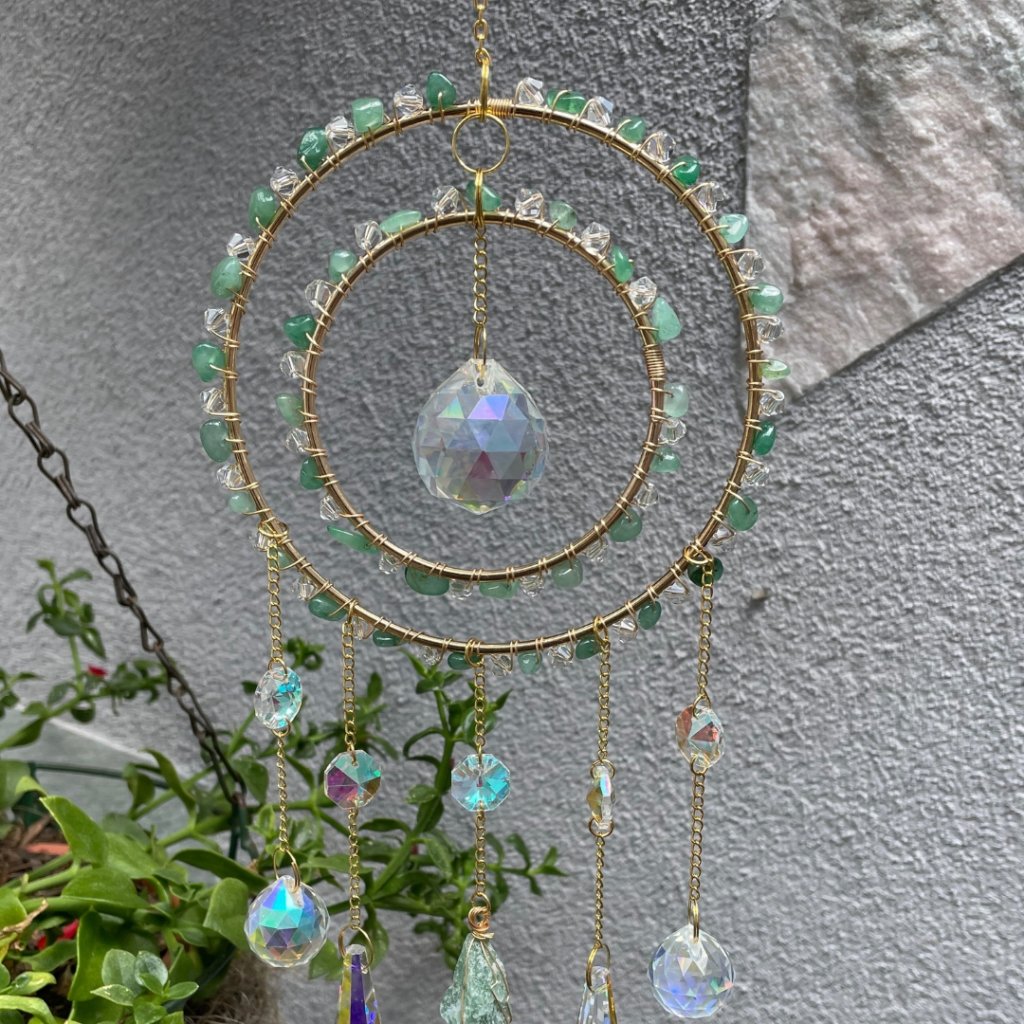 Přineste do svého domova jemnou energii harmonie a prosperity s tímto elegantním lapačem slunce. Dva kruhy zdobené drobnými kamínky avanturínu a broušenými skleněnými prvky vytvářejí při dopadu světla kouzelné barevné odlesky. Ve středu se třpytí zavěšený broušený ověs, který rozptyluje světlo do prostoru, a spodní část zdobí surový avanturín doplněný dalšími broušenými závěsy. Jeho design podpoří optimální Feng Shui a vnese do interiéru klid, světlo a pozitivní atmosféru.