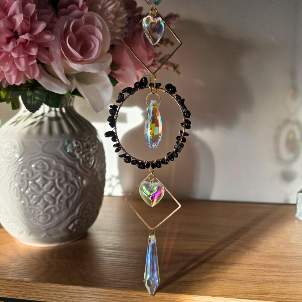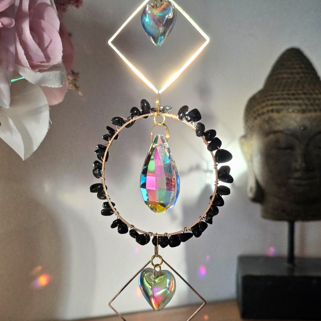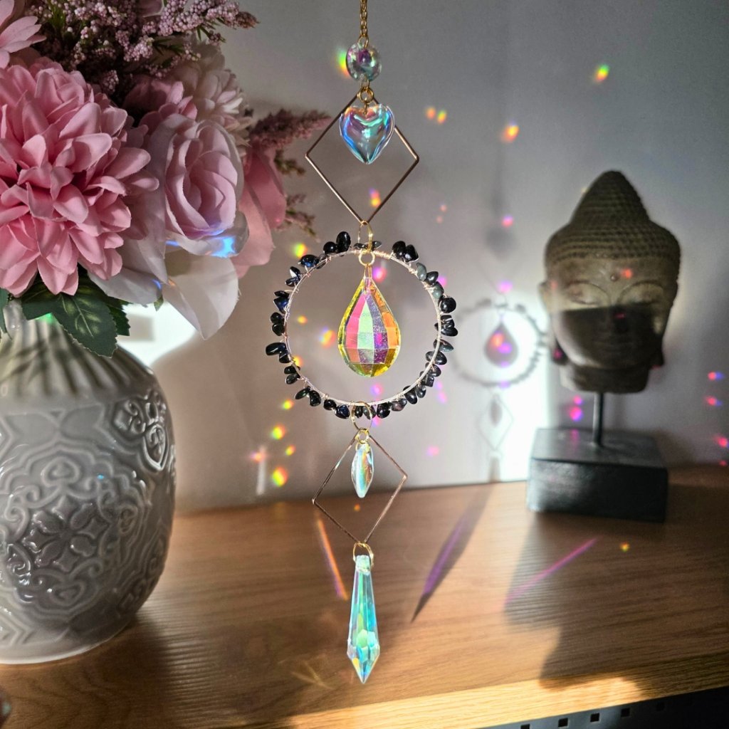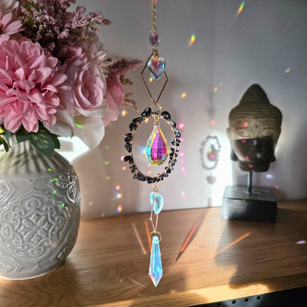 Elegantní lapač slunce s obsidiánem přináší do prostoru ochranu, stabilitu a klid. V okamžiku, kdy na něj dopadnou paprsky, promění světlo v jemné duhové odlesky, které rozjasní celý interiér. Je dlouhý přibližně 49 cm a průměr středového kruhu má 7 cm.