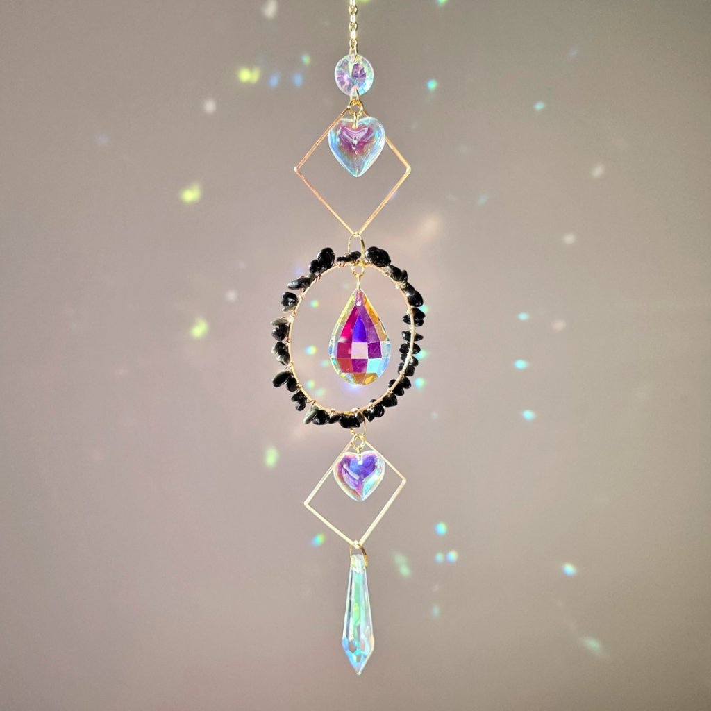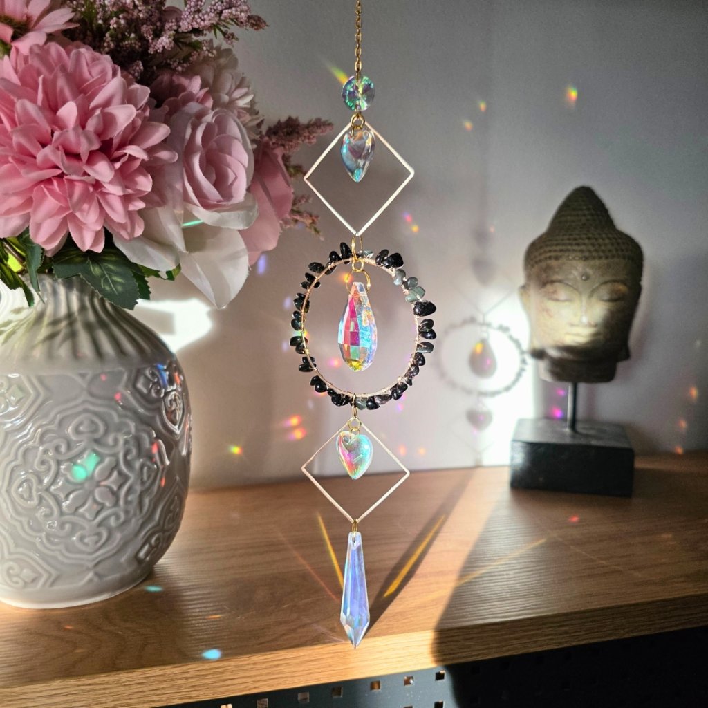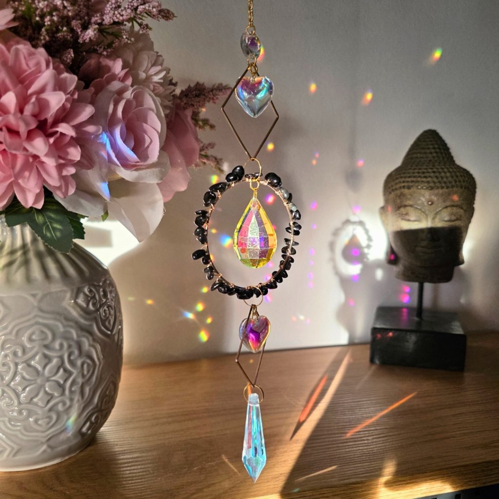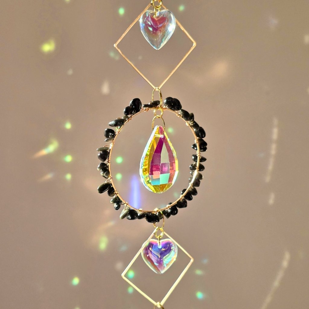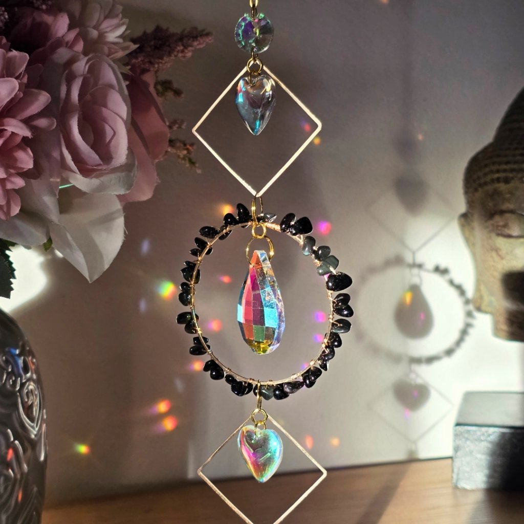 Elegantní lapač slunce s obsidiánem přináší do prostoru ochranu, stabilitu a klid. V okamžiku, kdy na něj dopadnou paprsky, promění světlo v jemné duhové odlesky, které rozjasní celý interiér. Je dlouhý přibližně 49 cm a průměr středového kruhu má 7 cm.