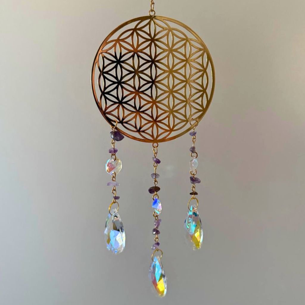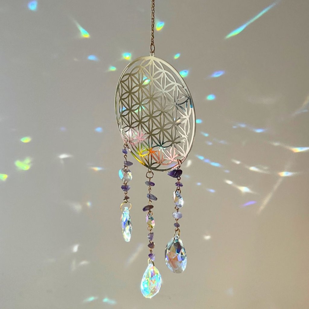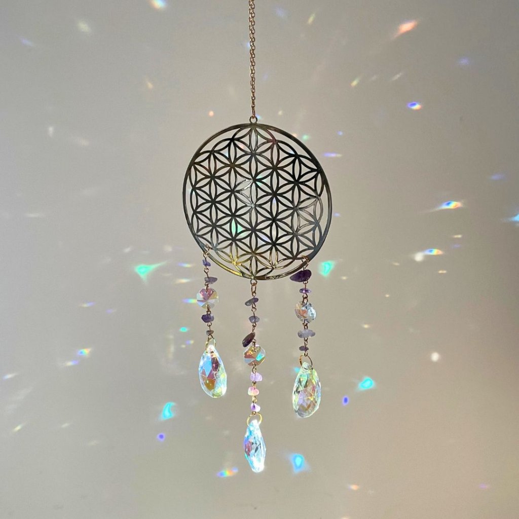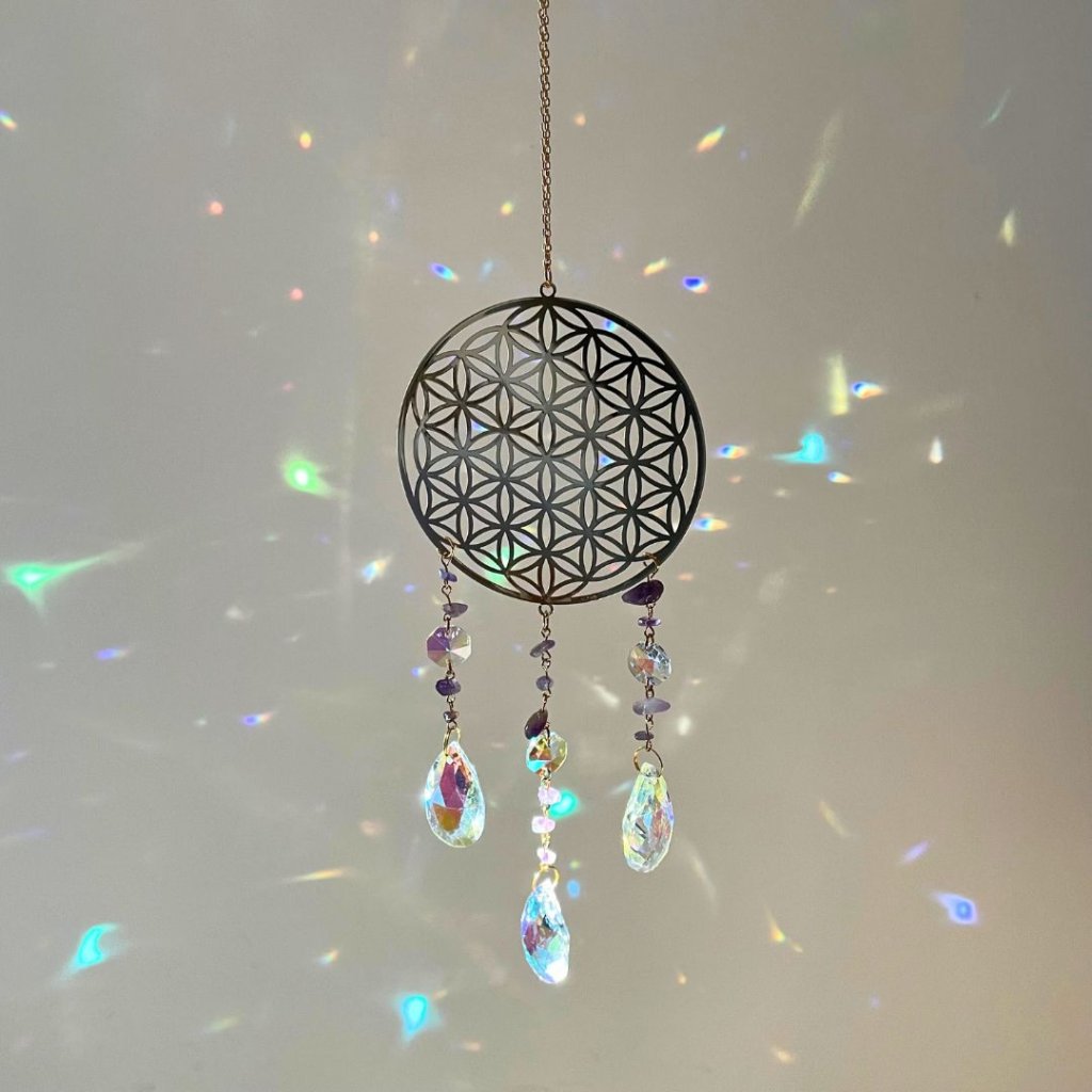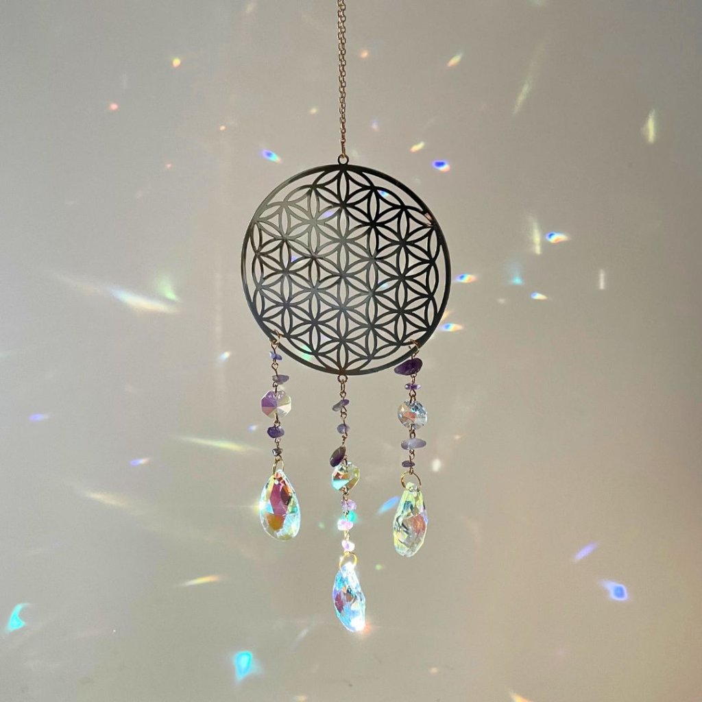 Lapač slunce – Spirituální propojení s ametystem a symbolem květu života, délka 39 cm