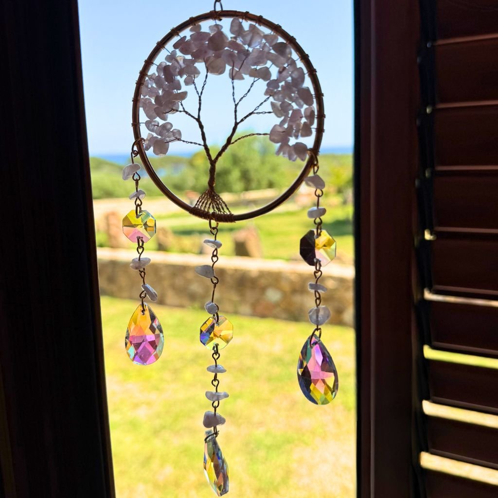Přineste do svého domova nádech duchovní energie a harmonie s tímto nádherným lapačem slunce se symbolem stromu života a krystaly z růženínu. Jeho jemná energie přispívá k optimálnímu Feng Shui a vytváří harmonii, která obohatí každý kout vašeho domova. Zavěšený na okně nebo nad sezonním stolem v terase, tento lapač slunce rozzáří váš prostor a přinese světlo a teplo, kamkoli ho umístíte.