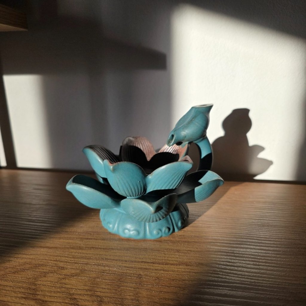 Nechte se unést magickou hrou světla a kouře. Tento keramický stojánek ve tvaru lotosového květu v tyrkysové barvě promění každé vykuřování v dechberoucí rituál. Díky zabudovanému osvětlení proudí kouř jemně dolů po okvětních lístcích jako vodopád a vytváří fascinující efekt, který uklidní mysl i prostor kolem vás.