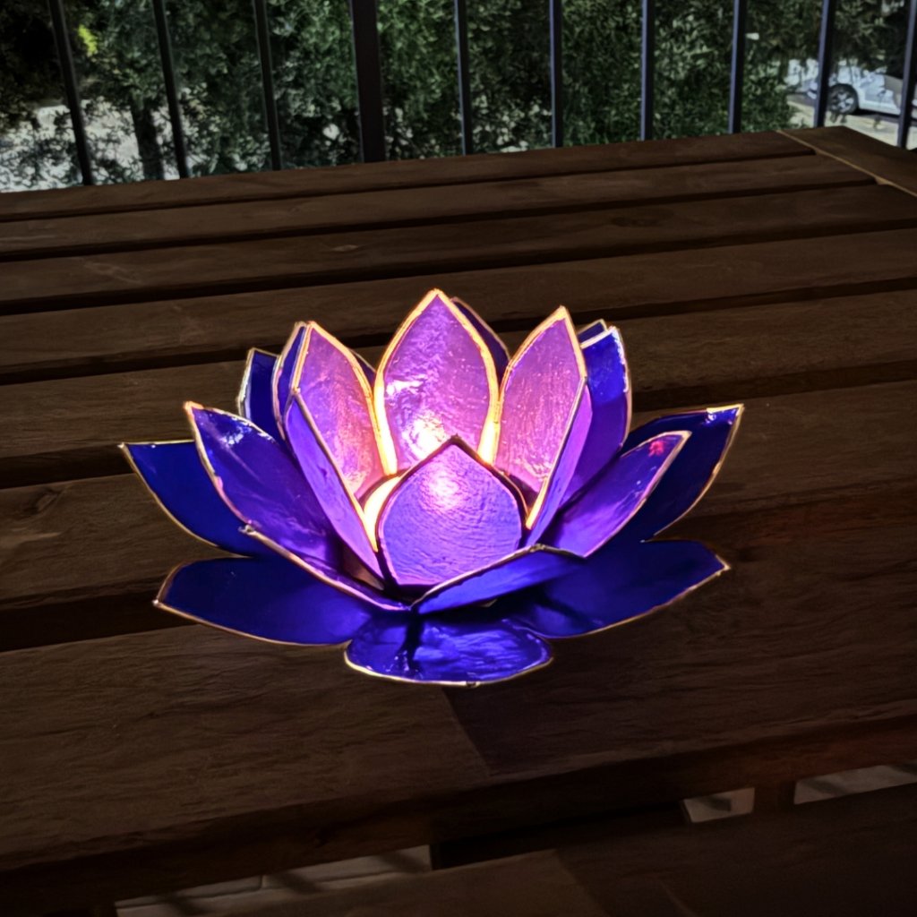 Tento svícen je ručně vyrobený z jemných plátků přírodních lastur, složených do tvaru lotosového květu. Hluboká indigo barva působí noblesně a tajemně, zatímco zlaté lemování zvýrazňuje tvar každého okvětního lístku a dodává mu luxusní nádech. Když do něj vložíte čajovou svíčku, světlo se odráží od lesklého povrchu lastur, prolíná se s modrofialovými tóny a vytváří atmosféru, která zklidní mysl a zároveň dodá interiéru výjimečnost.