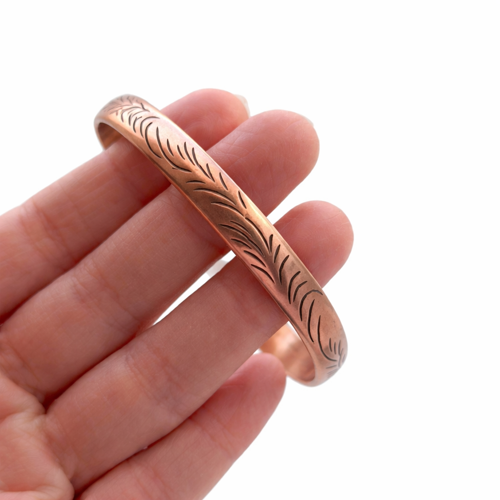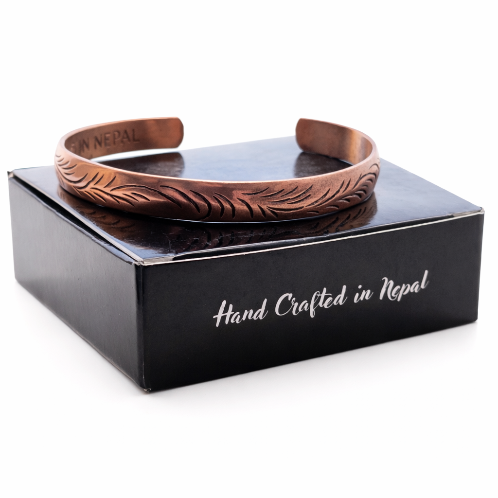 Jemný ručně vyráběný měděný náramek z Nepálu s rytým ornamentem zaujme svou jednoduchostí, symbolikou i autentickým zpracováním. Každý kus vzniká ručně, a právě proto je každý náramek originál. Může se lehce lišit kresbou, odstínem mědi i drobnými detaily povrchu. Uvnitř náramku najdete rytinu "Crafted in Nepal", která připomíná jeho poctivý původ i řemeslné zpracování.