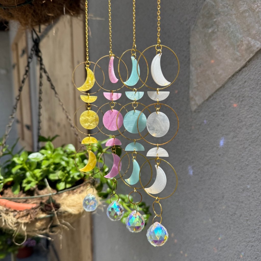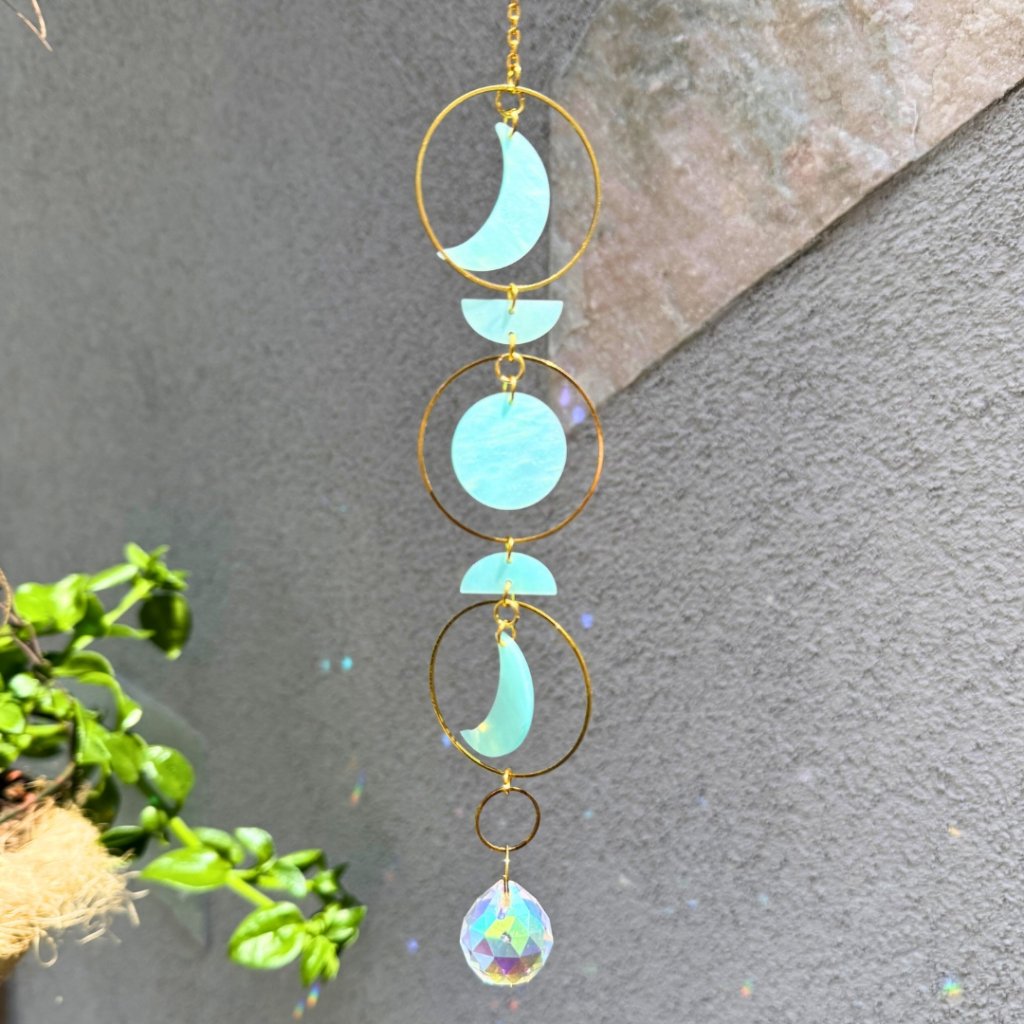 Vneste do svého prostoru klid, lehkost a trochu nebe. Tento jemný minimalistický lapač v tónech blankytné modři propojuje měsíční cyklus se zlatými liniemi, které odrážejí světlo a vytvářejí třpytivé duhové odlesky po celé místnosti.