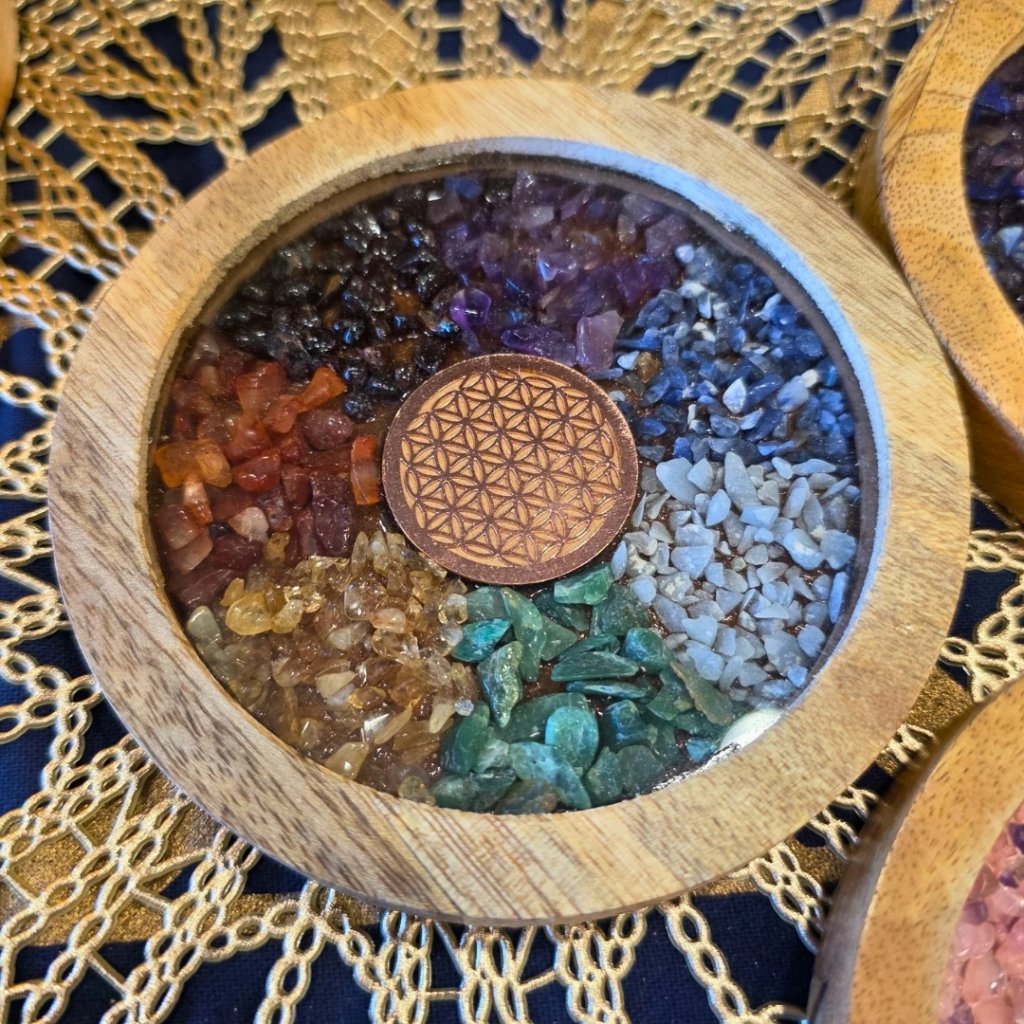 Objevte krásu a magii našich podtácků z mangového dřeva, které jsou zdobeny polodrahokamy v barvě 7 čaker a měděným symbolem květu života. Tato kombinace nejen zkrášlí váš domov, ale také přináší pohodu a harmonii do vašeho každodenního života.