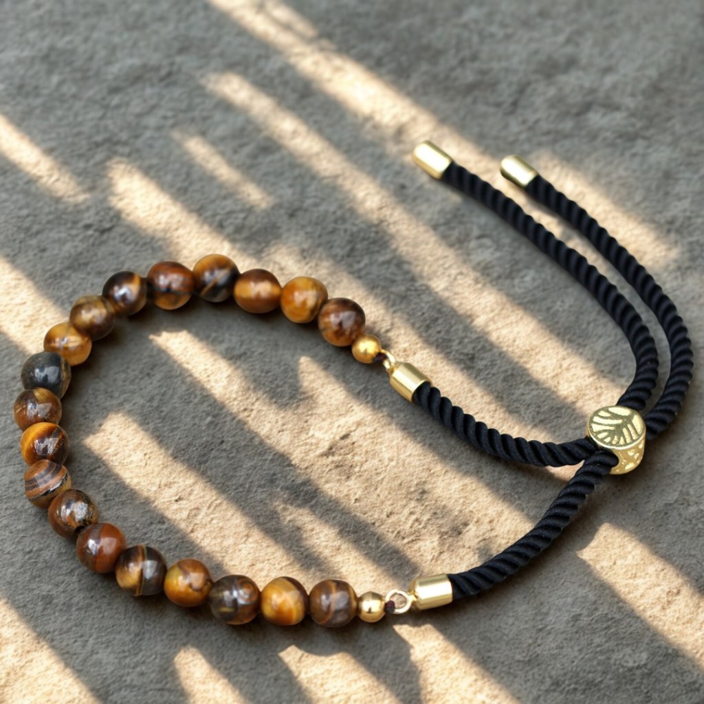 Elegantní náramek s přírodními korálky z tygřího oka spojuje sílu kamene s precizním zpracováním. Kombinace 18K pozlacených prvků a černé šňůrky působí minimalisticky, ale zároveň luxusně. Díky posuvnému zapínání se snadno přizpůsobí jakémukoli zápěstí a pohodlně se nosí celý den.