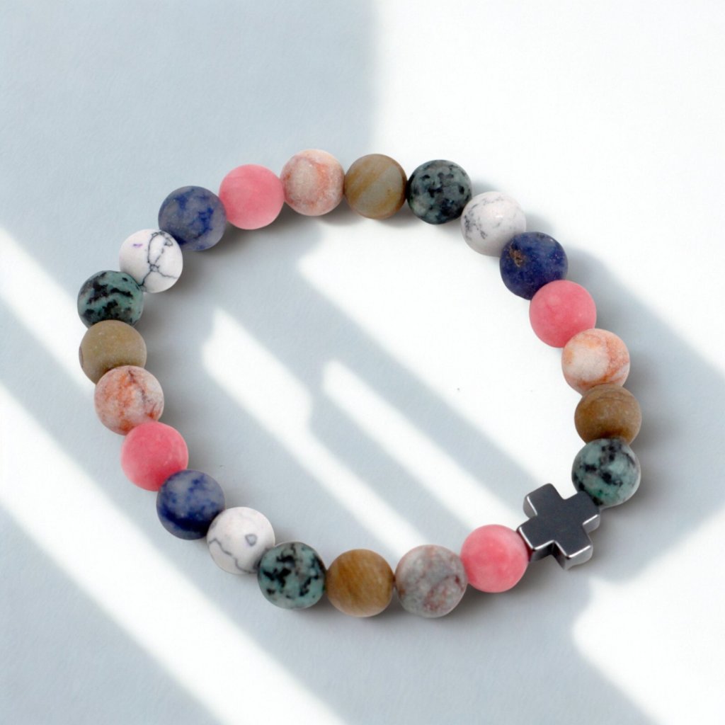 - Kovový křížek – drobný detail, který náramku dodává sílu i symboliku. Elegantní, nenápadný, ale s jasným významem.