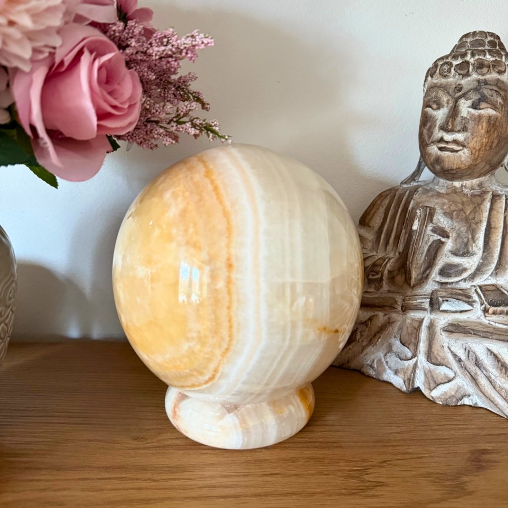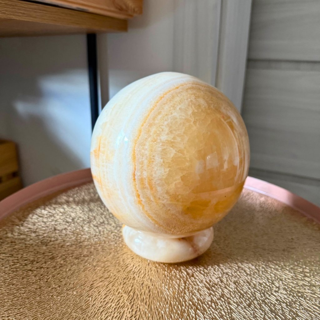 Kulatá lampa z přírodního aragonitu přináší do interiéru jemné světlo a klidnou energii kamene. Každý kus je ručně opracovaný originál, který vznikl z horniny těžené v Pákistánu, známé pod názvem „pákistánský onyx“. Při rozsvícení se jemné vrstvy kamene rozzáří zlatavými a medovými odstíny a promění prostor v místo pohody a ticha.