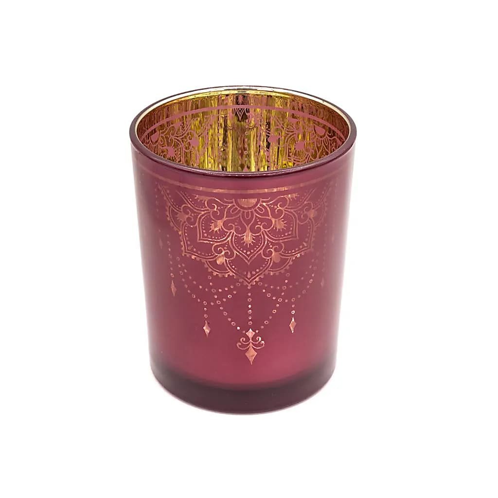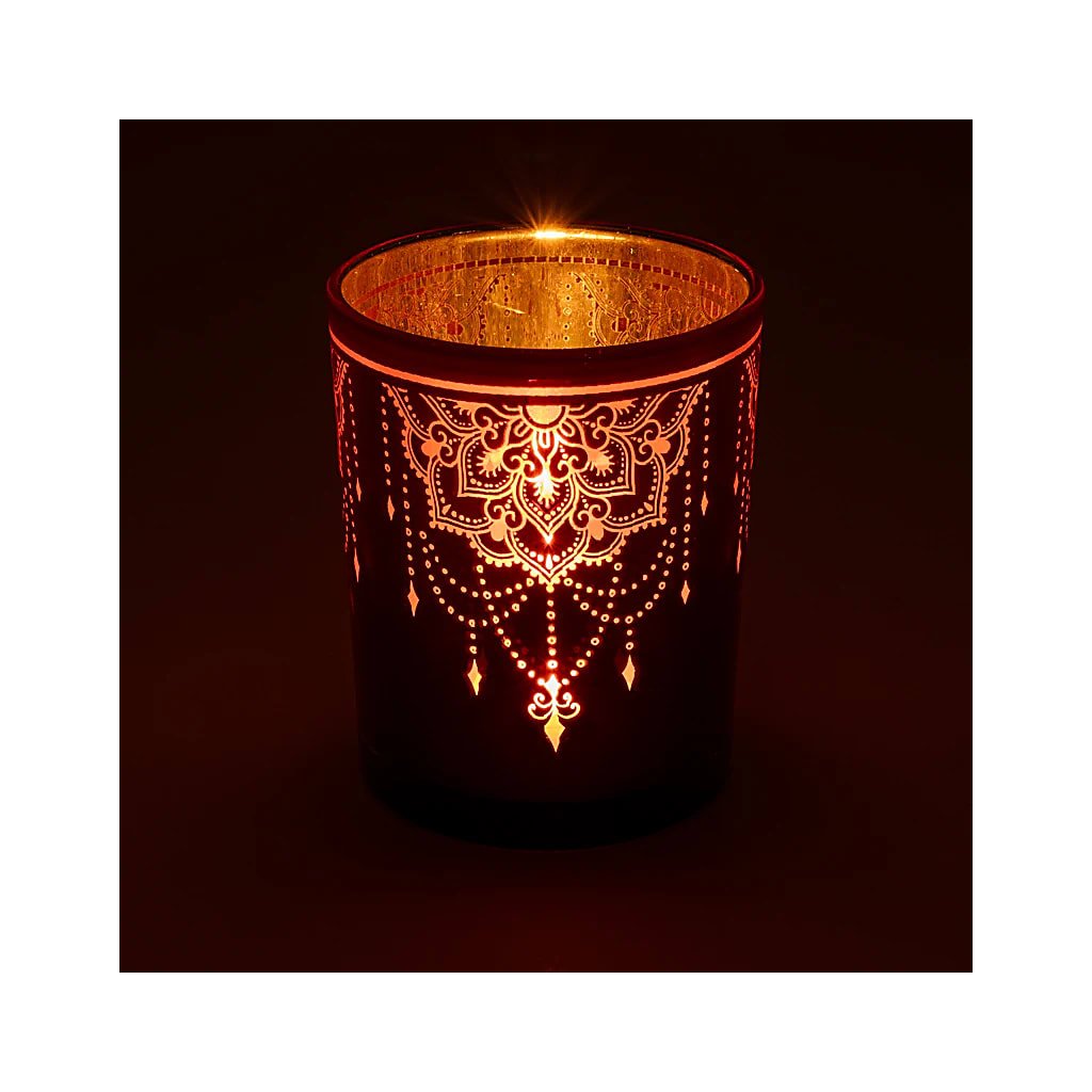 Představte si okamžik, kdy zapadne slunce a prostor se zahalí do klidu. V tom tichu zazáří světlo svíčky – a na skle se rozzáří mandala, jako by ožila. Tento tmavě růžový svícen s jemným zlatým vnitřkem vytváří při zapálení magickou hru světla a stínu. Uvnitř odráží teplé tóny plamene, zvenku září jemný ornament s orientálním nádechem.