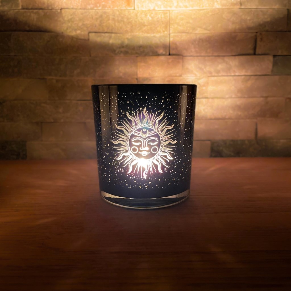 Tento stylový černý skleněný svícen je navržen pro čajové a votivní svíčky. Na jedné straně je motiv slunce, na druhé měsíce, které při zapálení svíčky vytvářejí magický efekt připomínající noční oblohu. Černé sklo dodává svícnu elegantní a moderní vzhled, zatímco světlo procházející symboly přináší do místnosti uklidňující a harmonickou energii.