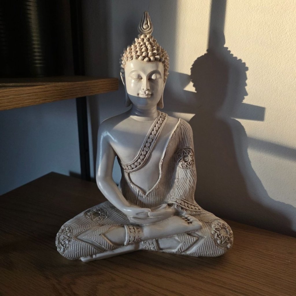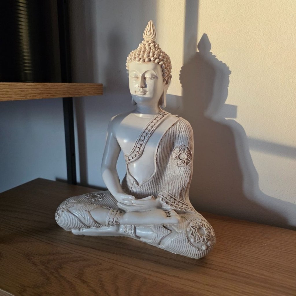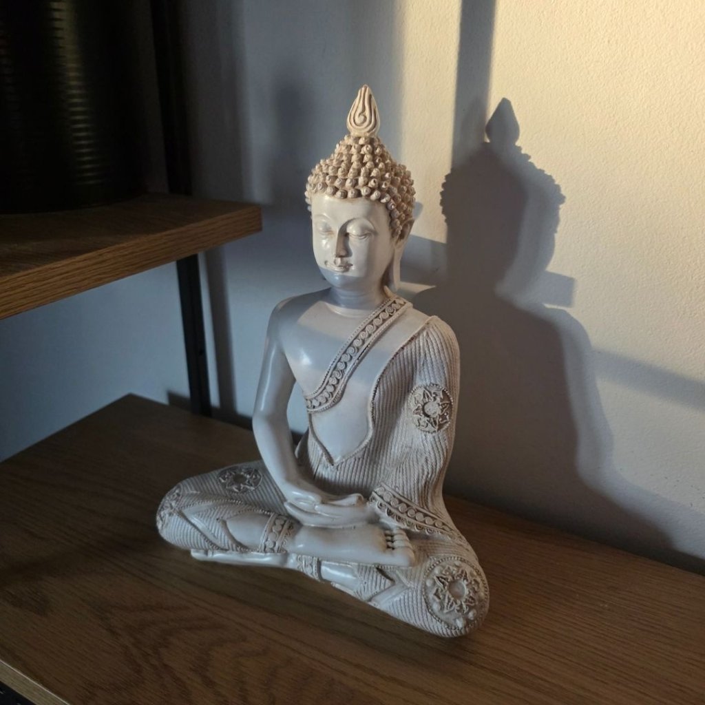Buddha sedí v meditační pozici s rukama položenýma v klíně, v pozici Dhyana mudra. Jemné thajské dekorativní prvky na oděvu odkazují na tradici a duchovní kontinuitu, zatímco svěží bílá barva podtrhuje čistotu celé kompozice. Soška se hodí jak do moderních interiérů, tak do přírodních a minimalistických prostor.