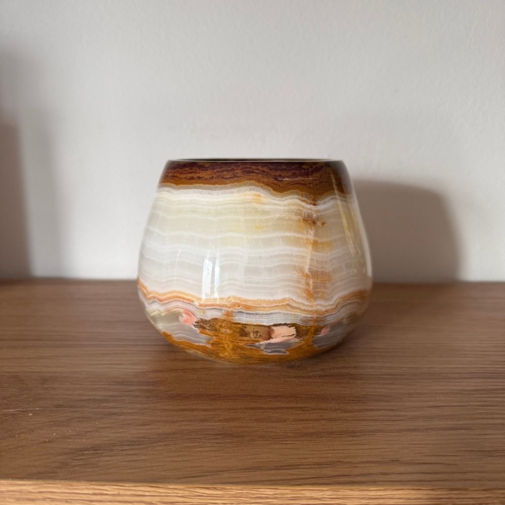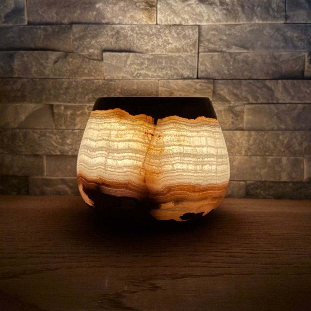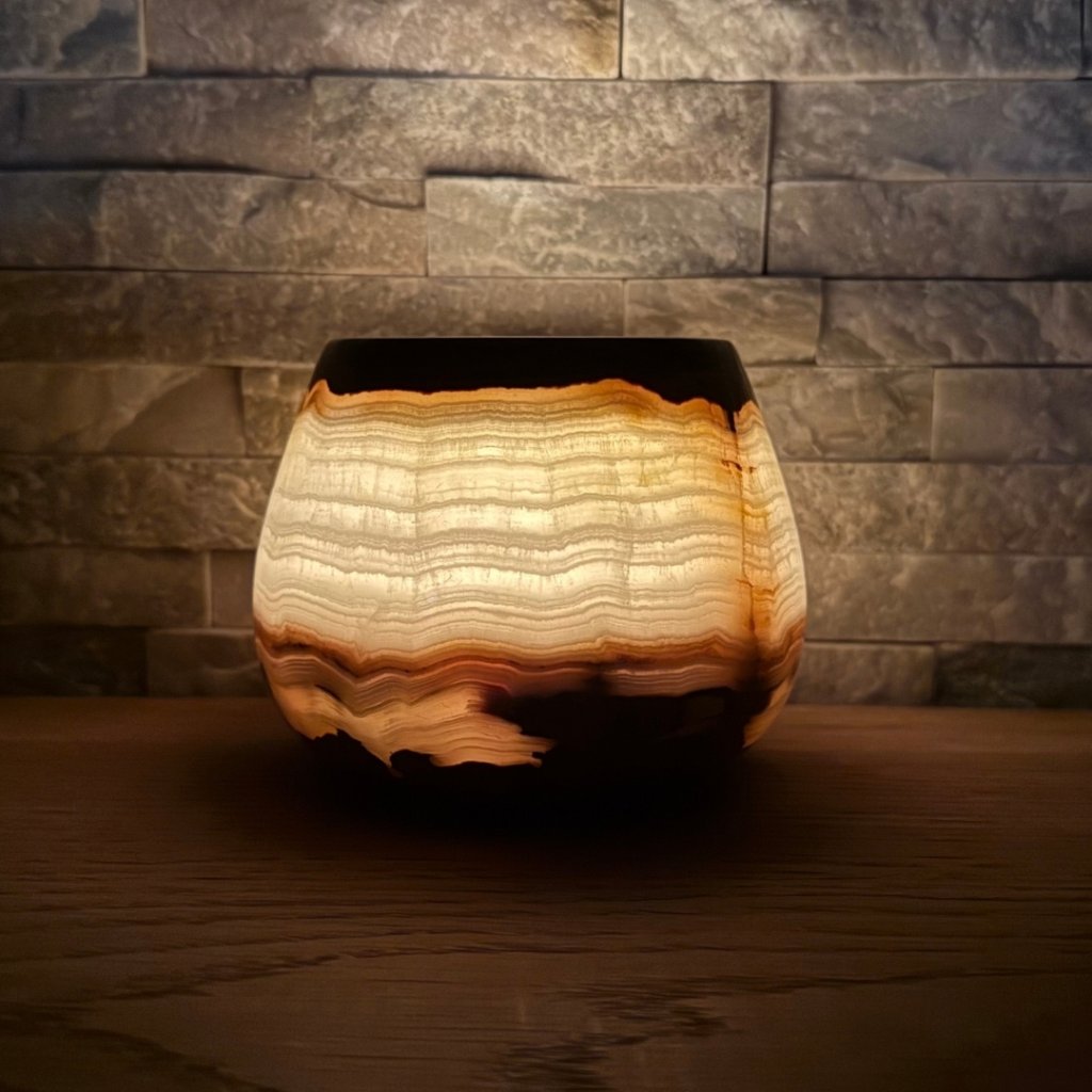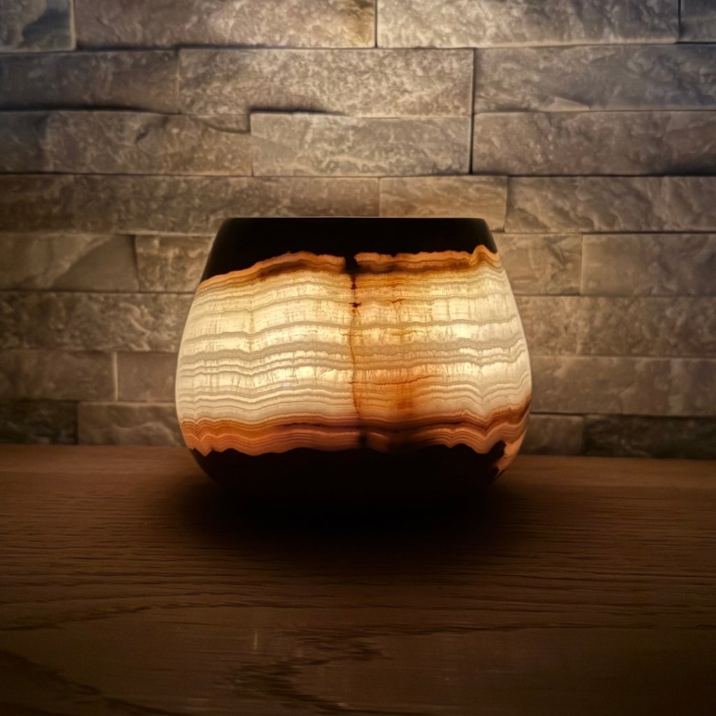 Svícen je vyroben z přírodního aragonitu, známého také jako pákistánský onyx. Tento kámen vyniká pevností, jemným leskem a přirozenou kresbou, která vznikala po tisíce let. Kupujete přesně ten svícen, který vidíte na fotografiích, žádný náhodný výběr, ale konkrétní originální kus.