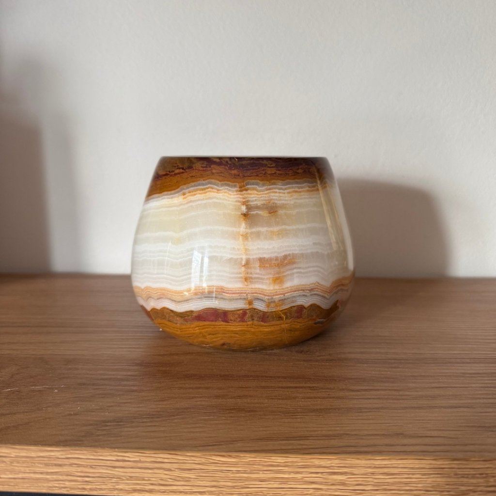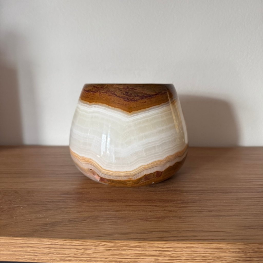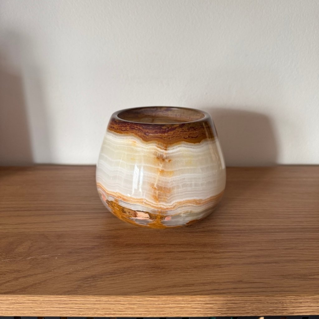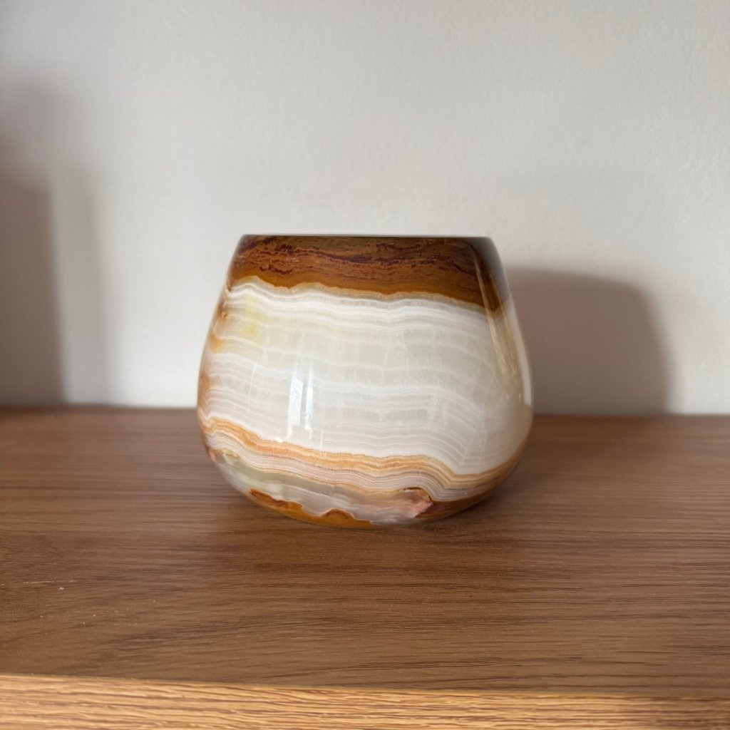 Svícen je vyroben z přírodního aragonitu, známého také jako pákistánský onyx. Tento kámen vyniká pevností, jemným leskem a přirozenou kresbou, která vznikala po tisíce let. Kupujete přesně ten svícen, který vidíte na fotografiích, žádný náhodný výběr, ale konkrétní originální kus.